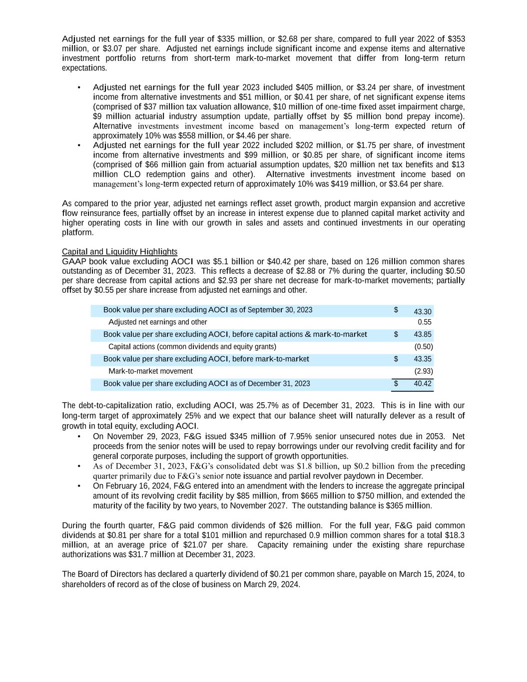 Adjusted net earnings for the full year of $335 million, or $2.68 per share, compared to full year 2022 of $353 million, or $3.07 per share. Adjusted net earnings include significant income and expense items and alternative investment portfolio returns from short-term mark-to-market movement that differ from long-term return expectations. • Adjusted net earnings for the full year 2023 included $405 million, or $3.24 per share, of investment income from alternative investments and $51 million, or $0.41 per share, of net significant expense items (comprised of $37 million tax valuation allowance, $10 million of one-time fixed asset impairment charge, $9 million actuarial industry assumption update, partially offset by $5 million bond prepay income). Alternative investments investment income based on management’s long-term expected return of approximately 10% was $558 million, or $4.46 per share. • Adjusted net earnings for the full year 2022 included $202 million, or $1.75 per share, of investment income from alternative investments and $99 million, or $0.85 per share, of significant income items (comprised of $66 million gain from actuarial assumption updates, $20 million net tax benefits and $13 million CLO redemption gains and other). Alternative investments investment income based on management’s long-term expected return of approximately 10% was $419 million, or $3.64 per share. As compared to the prior year, adjusted net earnings reflect asset growth, product margin expansion and accretive flow reinsurance fees, partially offset by an increase in interest expense due to planned capital market activity and higher operating costs in line with our growth in sales and assets and continued investments in our operating platform. Capital and Liquidity Highlights GAAP book value excluding AOCI was $5.1 billion or $40.42 per share, based on 126 million common shares outstanding as of December 31, 2023. This reflects a decrease of $2.88 or 7% during the quarter, including $0.50 per share decrease from capital actions and $2.93 per share net decrease for mark-to-market movements; partially offset by $0.55 per share increase from adjusted net earnings and other. Book value per share excluding AOCI as of September 30, 2023 $ 43.30 Adjusted net earnings and other 0.55 Book value per share excluding AOCI, before capital actions & mark-to-market $ 43.85 Capital actions (common dividends and equity grants) (0.50) Book value per share excluding AOCI, before mark-to-market $ 43.35 Mark-to-market movement (2.93) Book value per share excluding AOCI as of December 31, 2023 $ 40.42 The debt-to-capitalization ratio, excluding AOCI, was 25.7% as of December 31, 2023. This is in line with our long-term target of approximately 25% and we expect that our balance sheet will naturally delever as a result of growth in total equity, excluding AOCI. • On November 29, 2023, F&G issued $345 million of 7.95% senior unsecured notes due in 2053. Net proceeds from the senior notes will be used to repay borrowings under our revolving credit facility and for general corporate purposes, including the support of growth opportunities. • As of December 31, 2023, F&G’s consolidated debt was $1.8 billion, up $0.2 billion from the preceding quarter primarily due to F&G’s senior note issuance and partial revolver paydown in December. • On February 16, 2024, F&G entered into an amendment with the lenders to increase the aggregate principal amount of its revolving credit facility by $85 million, from $665 million to $750 million, and extended the maturity of the facility by two years, to November 2027. The outstanding balance is $365 million. During the fourth quarter, F&G paid common dividends of $26 million. For the full year, F&G paid common dividends at $0.81 per share for a total $101 million and repurchased 0.9 million common shares for a total $18.3 million, at an average price of $21.07 per share. Capacity remaining under the existing share repurchase authorizations was $31.7 million at December 31, 2023. The Board of Directors has declared a quarterly dividend of $0.21 per common share, payable on March 15, 2024, to shareholders of record as of the close of business on March 29, 2024.