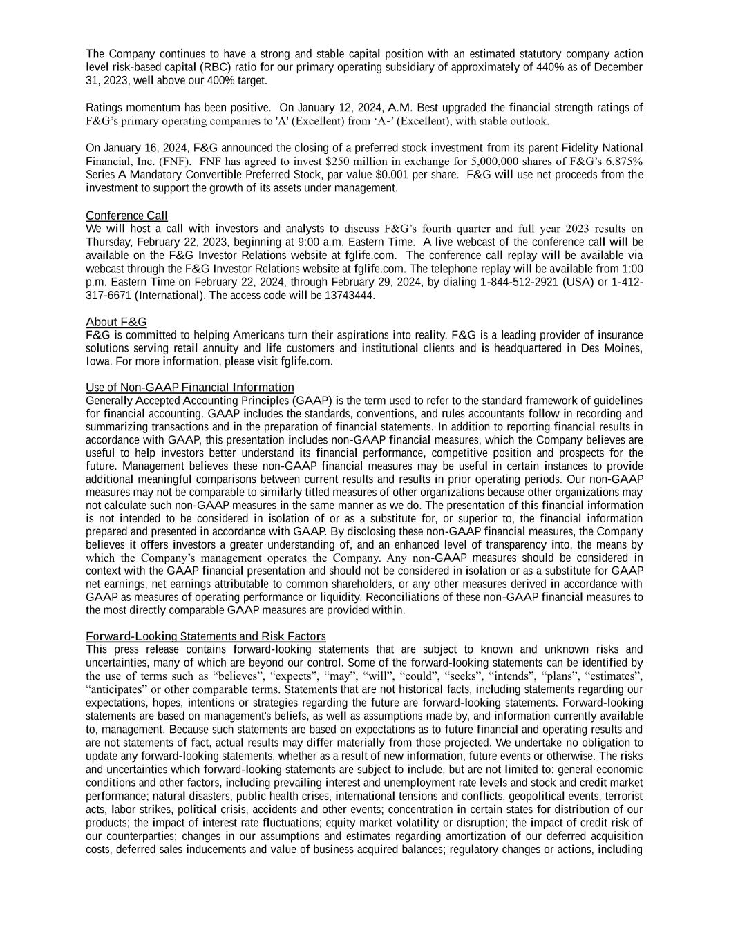 The Company continues to have a strong and stable capital position with an estimated statutory company action level risk-based capital (RBC) ratio for our primary operating subsidiary of approximately of 440% as of December 31, 2023, well above our 400% target. Ratings momentum has been positive. On January 12, 2024, A.M. Best upgraded the financial strength ratings of F&G’s primary operating companies to 'A' (Excellent) from ‘A-’ (Excellent), with stable outlook. On January 16, 2024, F&G announced the closing of a preferred stock investment from its parent Fidelity National Financial, Inc. (FNF). FNF has agreed to invest $250 million in exchange for 5,000,000 shares of F&G’s 6.875% Series A Mandatory Convertible Preferred Stock, par value $0.001 per share. F&G will use net proceeds from the investment to support the growth of its assets under management. Conference Call We will host a call with investors and analysts to discuss F&G’s fourth quarter and full year 2023 results on Thursday, February 22, 2023, beginning at 9:00 a.m. Eastern Time. A live webcast of the conference call will be available on the F&G Investor Relations website at fglife.com. The conference call replay will be available via webcast through the F&G Investor Relations website at fglife.com. The telephone replay will be available from 1:00 p.m. Eastern Time on February 22, 2024, through February 29, 2024, by dialing 1-844-512-2921 (USA) or 1-412- 317-6671 (International). The access code will be 13743444. About F&G F&G is committed to helping Americans turn their aspirations into reality. F&G is a leading provider of insurance solutions serving retail annuity and life customers and institutional clients and is headquartered in Des Moines, Iowa. For more information, please visit fglife.com. Use of Non-GAAP Financial Information Generally Accepted Accounting Principles (GAAP) is the term used to refer to the standard framework of guidelines for financial accounting. GAAP includes the standards, conventions, and rules accountants follow in recording and summarizing transactions and in the preparation of financial statements. In addition to reporting financial results in accordance with GAAP, this presentation includes non-GAAP financial measures, which the Company believes are useful to help investors better understand its financial performance, competitive position and prospects for the future. Management believes these non-GAAP financial measures may be useful in certain instances to provide additional meaningful comparisons between current results and results in prior operating periods. Our non-GAAP measures may not be comparable to similarly titled measures of other organizations because other organizations may not calculate such non-GAAP measures in the same manner as we do. The presentation of this financial information is not intended to be considered in isolation of or as a substitute for, or superior to, the financial information prepared and presented in accordance with GAAP. By disclosing these non-GAAP financial measures, the Company believes it offers investors a greater understanding of, and an enhanced level of transparency into, the means by which the Company’s management operates the Company. Any non-GAAP measures should be considered in context with the GAAP financial presentation and should not be considered in isolation or as a substitute for GAAP net earnings, net earnings attributable to common shareholders, or any other measures derived in accordance with GAAP as measures of operating performance or liquidity. Reconciliations of these non-GAAP financial measures to the most directly comparable GAAP measures are provided within. Forward-Looking Statements and Risk Factors This press release contains forward-looking statements that are subject to known and unknown risks and uncertainties, many of which are beyond our control. Some of the forward-looking statements can be identified by the use of terms such as “believes”, “expects”, “may”, “will”, “could”, “seeks”, “intends”, “plans”, “estimates”, “anticipates” or other comparable terms. Statements that are not historical facts, including statements regarding our expectations, hopes, intentions or strategies regarding the future are forward-looking statements. Forward-looking statements are based on management's beliefs, as well as assumptions made by, and information currently available to, management. Because such statements are based on expectations as to future financial and operating results and are not statements of fact, actual results may differ materially from those projected. We undertake no obligation to update any forward-looking statements, whether as a result of new information, future events or otherwise. The risks and uncertainties which forward-looking statements are subject to include, but are not limited to: general economic conditions and other factors, including prevailing interest and unemployment rate levels and stock and credit market performance; natural disasters, public health crises, international tensions and conflicts, geopolitical events, terrorist acts, labor strikes, political crisis, accidents and other events; concentration in certain states for distribution of our products; the impact of interest rate fluctuations; equity market volatility or disruption; the impact of credit risk of our counterparties; changes in our assumptions and estimates regarding amortization of our deferred acquisition costs, deferred sales inducements and value of business acquired balances; regulatory changes or actions, including
