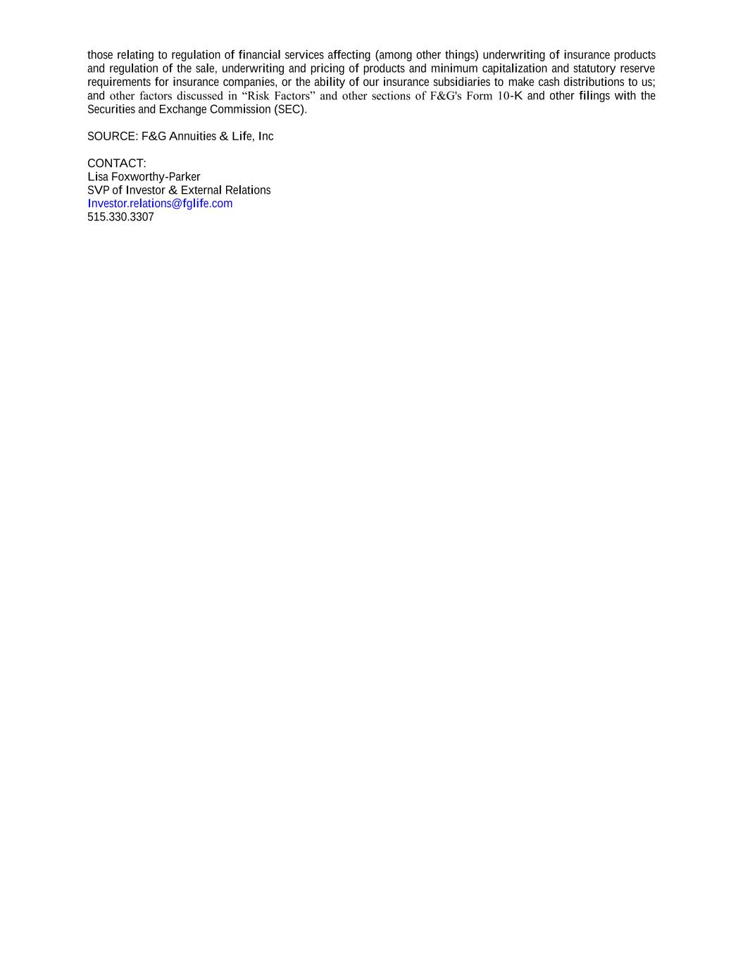 those relating to regulation of financial services affecting (among other things) underwriting of insurance products and regulation of the sale, underwriting and pricing of products and minimum capitalization and statutory reserve requirements for insurance companies, or the ability of our insurance subsidiaries to make cash distributions to us; and other factors discussed in “Risk Factors” and other sections of F&G's Form 10-K and other filings with the Securities and Exchange Commission (SEC). SOURCE: F&G Annuities & Life, Inc CONTACT: Lisa Foxworthy-Parker SVP of Investor & External Relations Investor.relations@fglife.com 515.330.3307