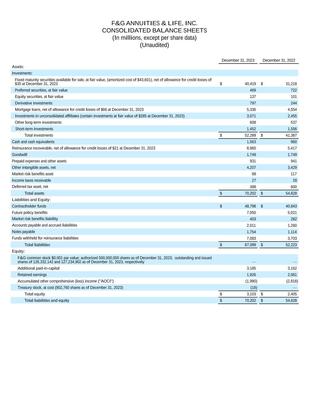F&G ANNUITIES & LIFE, INC. CONSOLIDATED BALANCE SHEETS (In millions, except per share data) (Unaudited) December 31, 2023 December 31, 2022 Assets: Investments: Fixed maturity securities available for sale, at fair value, (amortized cost of $43,601), net of allowance for credit losses of $35 at December 31, 2023 $ 40,419 $ 31,218 Preferred securities, at fair value 469 722 Equity securities, at fair value 137 101 Derivative investments 797 244 Mortgage loans, net of allowance for credit losses of $66 at December 31, 2023 5,336 4,554 Investments in unconsolidated affiliates (certain investments at fair value of $285 at December 31, 2023) 3,071 2,455 Other long-term investments 608 537 Short-term investments 1,452 1,556 Total investments $ 52,289 $ 41,387 Cash and cash equivalents 1,563 960 Reinsurance recoverable, net of allowance for credit losses of $21 at December 31, 2023 8,960 5,417 Goodwill 1,749 1,749 Prepaid expenses and other assets 931 941 Other intangible assets, net 4,207 3,429 Market risk benefits asset 88 117 Income taxes receivable 27 28 Deferred tax asset, net 388 600 Total assets $ 70,202 $ 54,628 Liabilities and Equity: Contractholder funds $ 48,798 $ 40,843 Future policy benefits 7,050 5,021 Market risk benefits liability 403 282 Accounts payable and accrued liabilities 2,011 1,260 Notes payable 1,754 1,114 Funds withheld for reinsurance liabilities 7,083 3,703 Total liabilities $ 67,099 $ 52,223 Equity: F&G common stock $0.001 par value; authorized 500,000,000 shares as of December 31, 2023; outstanding and issued shares of 126,332,142 and 127,234,902 as of December 31, 2023, respectively — — Additional paid-in-capital 3,185 3,162 Retained earnings 1,926 2,061 Accumulated other comprehensive (loss) income ("AOCI") (1,990) (2,818) Treasury stock, at cost (902,760 shares as of December 31, 2023) (18) — Total equity $ 3,103 $ 2,405 Total liabilities and equity $ 70,202 $ 54,628