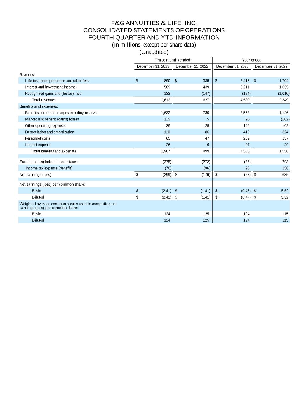 F&G ANNUITIES & LIFE, INC. CONSOLIDATED STATEMENTS OF OPERATIONS FOURTH QUARTER AND YTD INFORMATION (In millions, except per share data) (Unaudited) Three months ended Year ended December 31, 2023 December 31, 2022 December 31, 2023 December 31, 2022 Revenues: Life insurance premiums and other fees $ 890 $ 335 $ 2,413 $ 1,704 Interest and investment income 589 439 2,211 1,655 Recognized gains and (losses), net 133 (147) (124) (1,010) Total revenues 1,612 627 4,500 2,349 Benefits and expenses: Benefits and other changes in policy reserves 1,632 730 3,553 1,126 Market risk benefit (gains) losses 115 5 95 (182) Other operating expenses 39 25 146 102 Depreciation and amortization 110 86 412 324 Personnel costs 65 47 232 157 Interest expense 26 6 97 29 Total benefits and expenses 1,987 899 4,535 1,556 Earnings (loss) before income taxes (375) (272) (35) 793 Income tax expense (benefit) (76) (96) 23 158 Net earnings (loss) $ (299) $ (176) $ (58) $ 635 Net earnings (loss) per common share: Basic $ (2.41) $ (1.41) $ (0.47) $ 5.52 Diluted $ (2.41) $ (1.41) $ (0.47) $ 5.52 Weighted average common shares used in computing net earnings (loss) per common share: Basic 124 125 124 115 Diluted 124 125 124 115