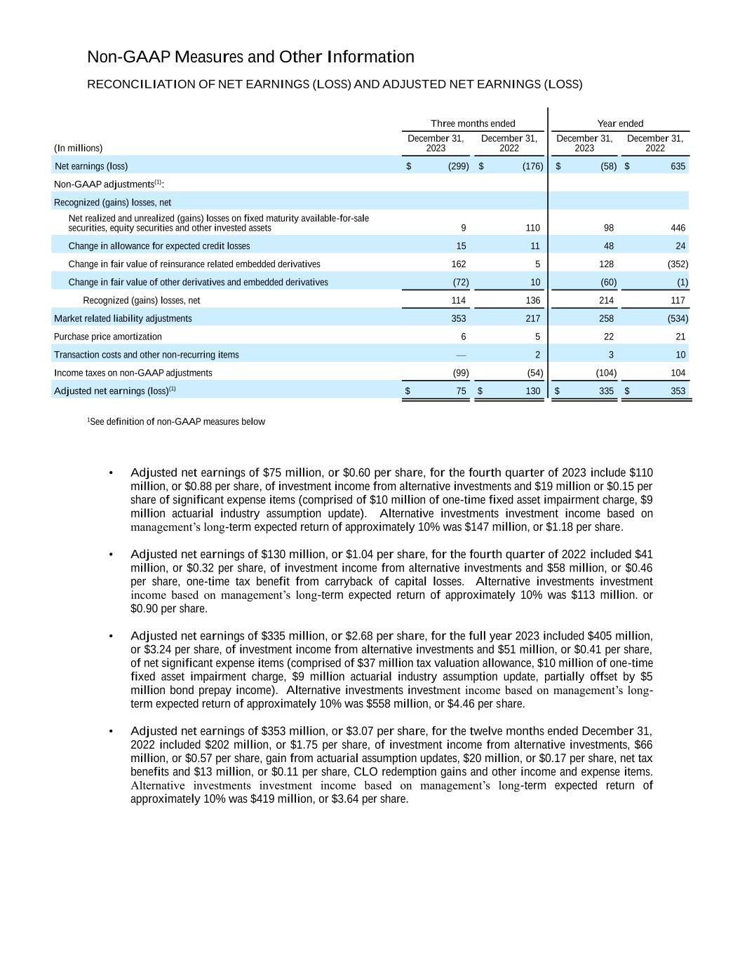 Non-GAAP Measures and Other Information RECONCILIATION OF NET EARNINGS (LOSS) AND ADJUSTED NET EARNINGS (LOSS) Three months ended Year ended (In millions) December 31, 2023 December 31, 2022 December 31, 2023 December 31, 2022 Net earnings (loss) $ (299) $ (176) $ (58) $ 635 Non-GAAP adjustments(1): Recognized (gains) losses, net Net realized and unrealized (gains) losses on fixed maturity available-for-sale securities, equity securities and other invested assets 9 110 98 446 Change in allowance for expected credit losses 15 11 48 24 Change in fair value of reinsurance related embedded derivatives 162 5 128 (352) Change in fair value of other derivatives and embedded derivatives (72) 10 (60) (1) Recognized (gains) losses, net 114 136 214 117 Market related liability adjustments 353 217 258 (534) Purchase price amortization 6 5 22 21 Transaction costs and other non-recurring items — 2 3 10 Income taxes on non-GAAP adjustments (99) (54) (104) 104 Adjusted net earnings (loss)(1) $ 75 $ 130 $ 335 $ 353 1See definition of non-GAAP measures below • Adjusted net earnings of $75 million, or $0.60 per share, for the fourth quarter of 2023 include $110 million, or $0.88 per share, of investment income from alternative investments and $19 million or $0.15 per share of significant expense items (comprised of $10 million of one-time fixed asset impairment charge, $9 million actuarial industry assumption update). Alternative investments investment income based on management’s long-term expected return of approximately 10% was $147 million, or $1.18 per share. • Adjusted net earnings of $130 million, or $1.04 per share, for the fourth quarter of 2022 included $41 million, or $0.32 per share, of investment income from alternative investments and $58 million, or $0.46 per share, one-time tax benefit from carryback of capital losses. Alternative investments investment income based on management’s long-term expected return of approximately 10% was $113 million. or $0.90 per share. • Adjusted net earnings of $335 million, or $2.68 per share, for the full year 2023 included $405 million, or $3.24 per share, of investment income from alternative investments and $51 million, or $0.41 per share, of net significant expense items (comprised of $37 million tax valuation allowance, $10 million of one-time fixed asset impairment charge, $9 million actuarial industry assumption update, partially offset by $5 million bond prepay income). Alternative investments investment income based on management’s long- term expected return of approximately 10% was $558 million, or $4.46 per share. • Adjusted net earnings of $353 million, or $3.07 per share, for the twelve months ended December 31, 2022 included $202 million, or $1.75 per share, of investment income from alternative investments, $66 million, or $0.57 per share, gain from actuarial assumption updates, $20 million, or $0.17 per share, net tax benefits and $13 million, or $0.11 per share, CLO redemption gains and other income and expense items. Alternative investments investment income based on management’s long-term expected return of approximately 10% was $419 million, or $3.64 per share.