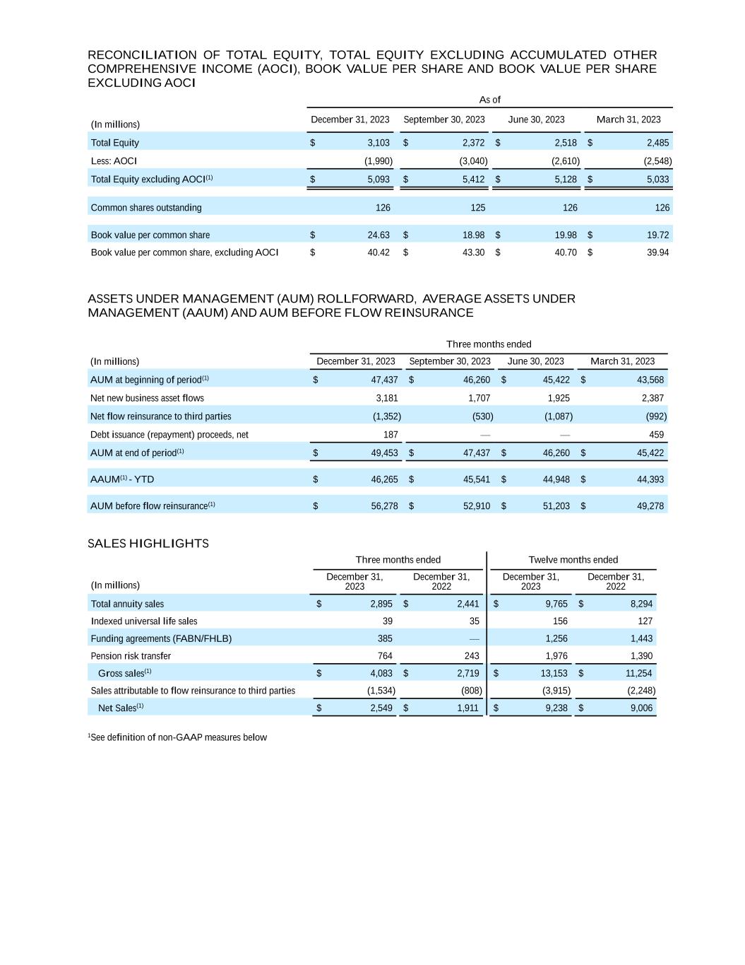 RECONCILIATION OF TOTAL EQUITY, TOTAL EQUITY EXCLUDING ACCUMULATED OTHER COMPREHENSIVE INCOME (AOCI), BOOK VALUE PER SHARE AND BOOK VALUE PER SHARE EXCLUDING AOCI As of (In millions) December 31, 2023 September 30, 2023 June 30, 2023 March 31, 2023 Total Equity $ 3,103 $ 2,372 $ 2,518 $ 2,485 Less: AOCI (1,990) (3,040) (2,610) (2,548) Total Equity excluding AOCI(1) $ 5,093 $ 5,412 $ 5,128 $ 5,033 Common shares outstanding 126 125 126 126 Book value per common share $ 24.63 $ 18.98 $ 19.98 $ 19.72 Book value per common share, excluding AOCI $ 40.42 $ 43.30 $ 40.70 $ 39.94 ASSETS UNDER MANAGEMENT (AUM) ROLLFORWARD, AVERAGE ASSETS UNDER MANAGEMENT (AAUM) AND AUM BEFORE FLOW REINSURANCE Three months ended (In millions) December 31, 2023 September 30, 2023 June 30, 2023 March 31, 2023 AUM at beginning of period(1) $ 47,437 $ 46,260 $ 45,422 $ 43,568 Net new business asset flows 3,181 1,707 1,925 2,387 Net flow reinsurance to third parties (1,352) (530) (1,087) (992) Debt issuance (repayment) proceeds, net 187 — — 459 AUM at end of period(1) $ 49,453 $ 47,437 $ 46,260 $ 45,422 AAUM(1) - YTD $ 46,265 $ 45,541 $ 44,948 $ 44,393 AUM before flow reinsurance(1) $ 56,278 $ 52,910 $ 51,203 $ 49,278 SALES HIGHLIGHTS Three months ended Twelve months ended (In millions) December 31, 2023 December 31, 2022 December 31, 2023 December 31, 2022 Total annuity sales $ 2,895 $ 2,441 $ 9,765 $ 8,294 Indexed universal life sales 39 35 156 127 Funding agreements (FABN/FHLB) 385 — 1,256 1,443 Pension risk transfer 764 243 1,976 1,390 Gross sales(1) $ 4,083 $ 2,719 $ 13,153 $ 11,254 Sales attributable to flow reinsurance to third parties (1,534) (808) (3,915) (2,248) Net Sales(1) $ 2,549 $ 1,911 $ 9,238 $ 9,006 1See definition of non-GAAP measures below