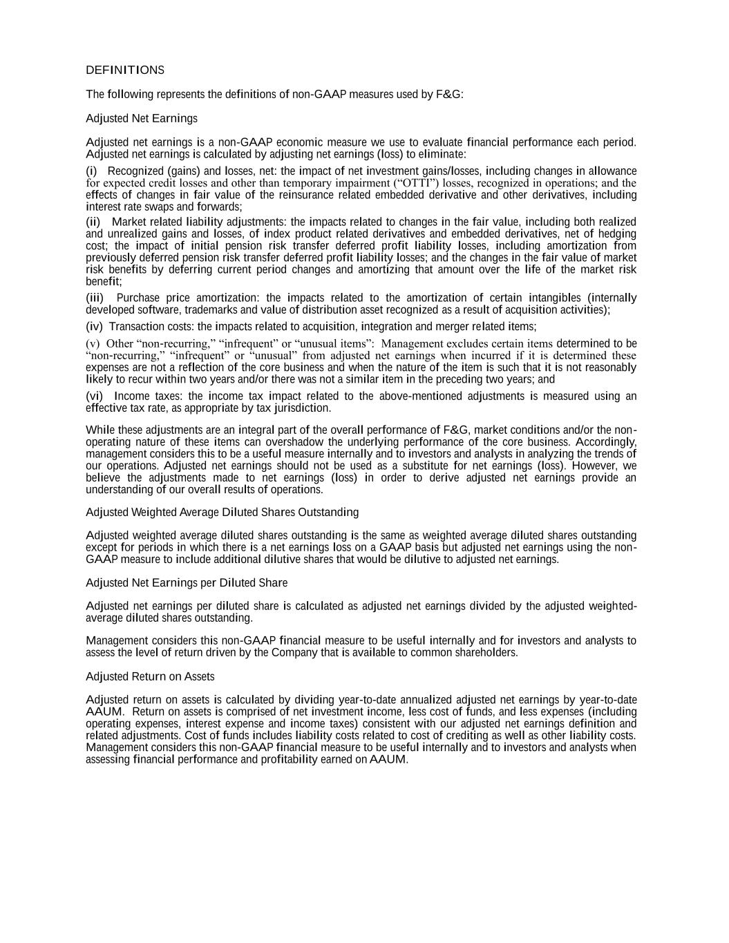 DEFINITIONS The following represents the definitions of non-GAAP measures used by F&G: Adjusted Net Earnings Adjusted net earnings is a non-GAAP economic measure we use to evaluate financial performance each period. Adjusted net earnings is calculated by adjusting net earnings (loss) to eliminate: (i) Recognized (gains) and losses, net: the impact of net investment gains/losses, including changes in allowance for expected credit losses and other than temporary impairment (“OTTI”) losses, recognized in operations; and the effects of changes in fair value of the reinsurance related embedded derivative and other derivatives, including interest rate swaps and forwards; (ii) Market related liability adjustments: the impacts related to changes in the fair value, including both realized and unrealized gains and losses, of index product related derivatives and embedded derivatives, net of hedging cost; the impact of initial pension risk transfer deferred profit liability losses, including amortization from previously deferred pension risk transfer deferred profit liability losses; and the changes in the fair value of market risk benefits by deferring current period changes and amortizing that amount over the life of the market risk benefit; (iii) Purchase price amortization: the impacts related to the amortization of certain intangibles (internally developed software, trademarks and value of distribution asset recognized as a result of acquisition activities); (iv) Transaction costs: the impacts related to acquisition, integration and merger related items; (v) Other “non-recurring,” “infrequent” or “unusual items”: Management excludes certain items determined to be “non-recurring,” “infrequent” or “unusual” from adjusted net earnings when incurred if it is determined these expenses are not a reflection of the core business and when the nature of the item is such that it is not reasonably likely to recur within two years and/or there was not a similar item in the preceding two years; and (vi) Income taxes: the income tax impact related to the above-mentioned adjustments is measured using an effective tax rate, as appropriate by tax jurisdiction. While these adjustments are an integral part of the overall performance of F&G, market conditions and/or the non- operating nature of these items can overshadow the underlying performance of the core business. Accordingly, management considers this to be a useful measure internally and to investors and analysts in analyzing the trends of our operations. Adjusted net earnings should not be used as a substitute for net earnings (loss). However, we believe the adjustments made to net earnings (loss) in order to derive adjusted net earnings provide an understanding of our overall results of operations. Adjusted Weighted Average Diluted Shares Outstanding Adjusted weighted average diluted shares outstanding is the same as weighted average diluted shares outstanding except for periods in which there is a net earnings loss on a GAAP basis but adjusted net earnings using the non- GAAP measure to include additional dilutive shares that would be dilutive to adjusted net earnings. Adjusted Net Earnings per Diluted Share Adjusted net earnings per diluted share is calculated as adjusted net earnings divided by the adjusted weighted- average diluted shares outstanding. Management considers this non-GAAP financial measure to be useful internally and for investors and analysts to assess the level of return driven by the Company that is available to common shareholders. Adjusted Return on Assets Adjusted return on assets is calculated by dividing year-to-date annualized adjusted net earnings by year-to-date AAUM. Return on assets is comprised of net investment income, less cost of funds, and less expenses (including operating expenses, interest expense and income taxes) consistent with our adjusted net earnings definition and related adjustments. Cost of funds includes liability costs related to cost of crediting as well as other liability costs. Management considers this non-GAAP financial measure to be useful internally and to investors and analysts when assessing financial performance and profitability earned on AAUM.