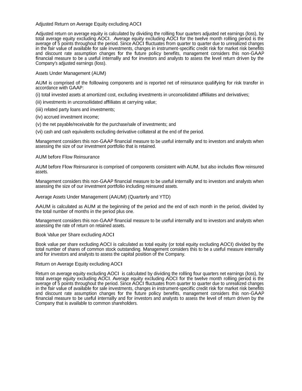 Adjusted Return on Average Equity excluding AOCI Adjusted return on average equity is calculated by dividing the rolling four quarters adjusted net earnings (loss), by total average equity excluding AOCI. Average equity excluding AOCI for the twelve month rolling period is the average of 5 points throughout the period. Since AOCI fluctuates from quarter to quarter due to unrealized changes in the fair value of available for sale investments, changes in instrument-specific credit risk for market risk benefits and discount rate assumption changes for the future policy benefits, management considers this non-GAAP financial measure to be a useful internally and for investors and analysts to assess the level return driven by the Company's adjusted earnings (loss). Assets Under Management (AUM) AUM is comprised of the following components and is reported net of reinsurance qualifying for risk transfer in accordance with GAAP: (i) total invested assets at amortized cost, excluding investments in unconsolidated affiliates and derivatives; (ii) investments in unconsolidated affiliates at carrying value; (iii) related party loans and investments; (iv) accrued investment income; (v) the net payable/receivable for the purchase/sale of investments; and (vi) cash and cash equivalents excluding derivative collateral at the end of the period. Management considers this non-GAAP financial measure to be useful internally and to investors and analysts when assessing the size of our investment portfolio that is retained. AUM before Flow Reinsurance AUM before Flow Reinsurance is comprised of components consistent with AUM, but also includes flow reinsured assets. Management considers this non-GAAP financial measure to be useful internally and to investors and analysts when assessing the size of our investment portfolio including reinsured assets. Average Assets Under Management (AAUM) (Quarterly and YTD) AAUM is calculated as AUM at the beginning of the period and the end of each month in the period, divided by the total number of months in the period plus one. Management considers this non-GAAP financial measure to be useful internally and to investors and analysts when assessing the rate of return on retained assets. Book Value per Share excluding AOCI Book value per share excluding AOCI is calculated as total equity (or total equity excluding AOCI) divided by the total number of shares of common stock outstanding. Management considers this to be a useful measure internally and for investors and analysts to assess the capital position of the Company. Return on Average Equity excluding AOCI Return on average equity excluding AOCI is calculated by dividing the rolling four quarters net earnings (loss), by total average equity excluding AOCI. Average equity excluding AOCI for the twelve month rolling period is the average of 5 points throughout the period. Since AOCI fluctuates from quarter to quarter due to unrealized changes in the fair value of available for sale investments, changes in instrument-specific credit risk for market risk benefits and discount rate assumption changes for the future policy benefits, management considers this non-GAAP financial measure to be useful internally and for investors and analysts to assess the level of return driven by the Company that is available to common shareholders.