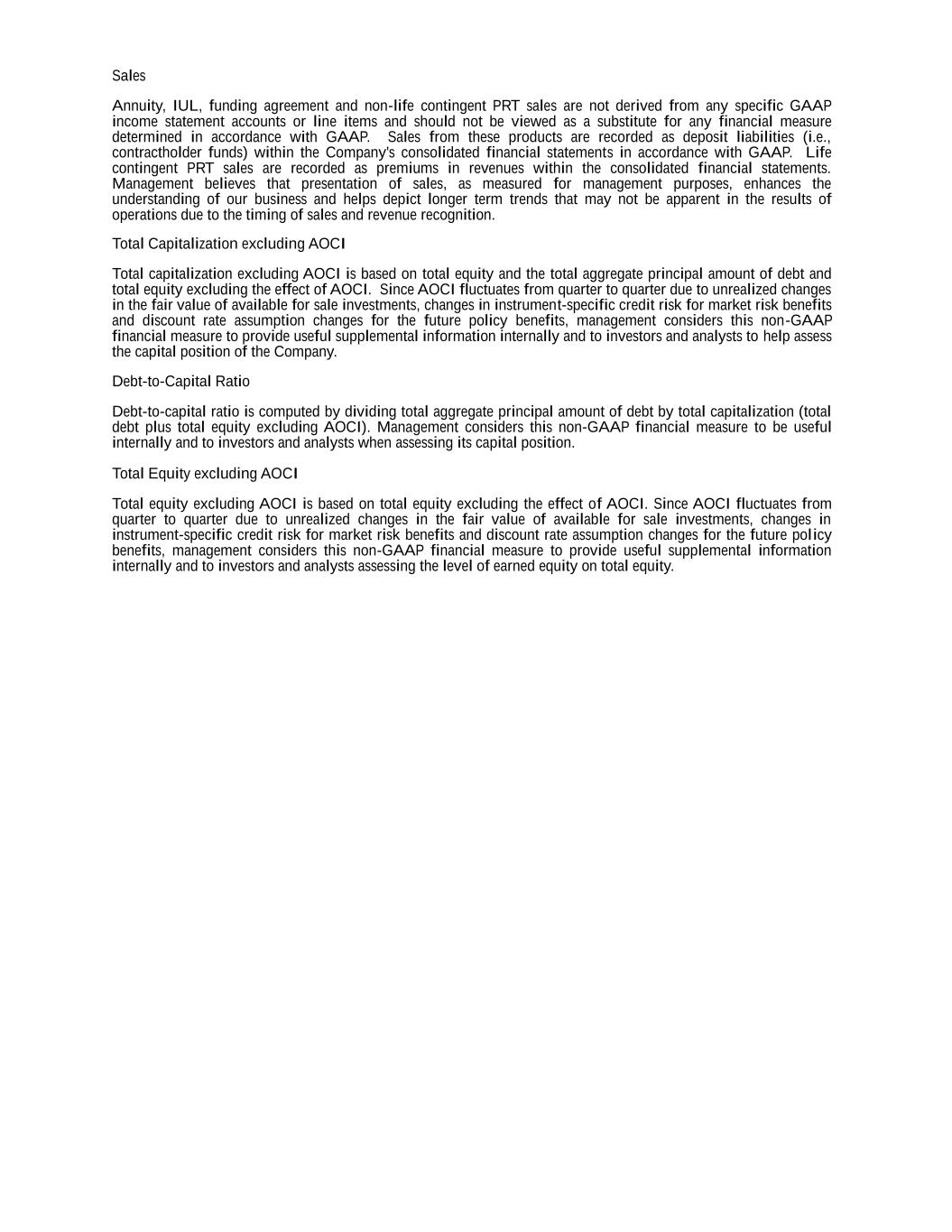 Sales Annuity, IUL, funding agreement and non-life contingent PRT sales are not derived from any specific GAAP income statement accounts or line items and should not be viewed as a substitute for any financial measure determined in accordance with GAAP. Sales from these products are recorded as deposit liabilities (i.e., contractholder funds) within the Company's consolidated financial statements in accordance with GAAP. Life contingent PRT sales are recorded as premiums in revenues within the consolidated financial statements. Management believes that presentation of sales, as measured for management purposes, enhances the understanding of our business and helps depict longer term trends that may not be apparent in the results of operations due to the timing of sales and revenue recognition. Total Capitalization excluding AOCI Total capitalization excluding AOCI is based on total equity and the total aggregate principal amount of debt and total equity excluding the effect of AOCI. Since AOCI fluctuates from quarter to quarter due to unrealized changes in the fair value of available for sale investments, changes in instrument-specific credit risk for market risk benefits and discount rate assumption changes for the future policy benefits, management considers this non-GAAP financial measure to provide useful supplemental information internally and to investors and analysts to help assess the capital position of the Company. Debt-to-Capital Ratio Debt-to-capital ratio is computed by dividing total aggregate principal amount of debt by total capitalization (total debt plus total equity excluding AOCI). Management considers this non-GAAP financial measure to be useful internally and to investors and analysts when assessing its capital position. Total Equity excluding AOCI Total equity excluding AOCI is based on total equity excluding the effect of AOCI. Since AOCI fluctuates from quarter to quarter due to unrealized changes in the fair value of available for sale investments, changes in instrument-specific credit risk for market risk benefits and discount rate assumption changes for the future policy benefits, management considers this non-GAAP financial measure to provide useful supplemental information internally and to investors and analysts assessing the level of earned equity on total equity.
