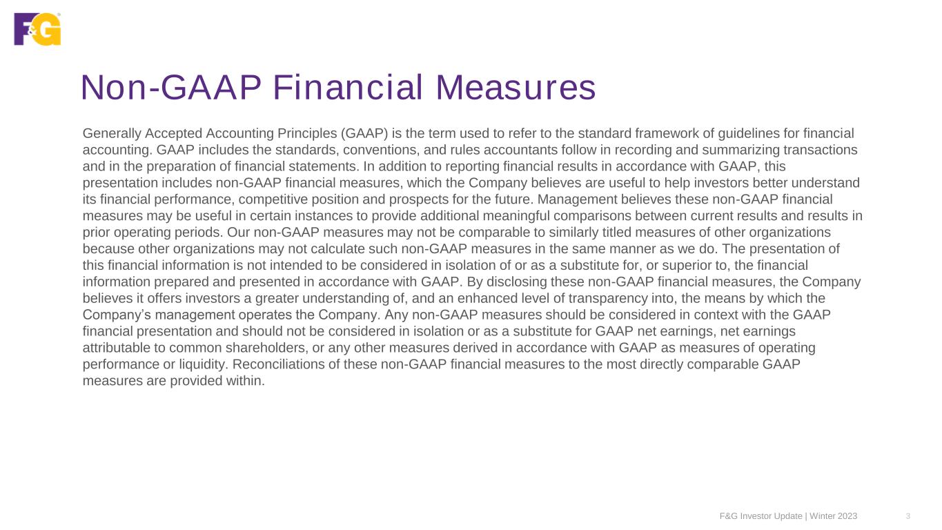 Disclaimer & Forward-Looking Statements This presentation contains forward-looking statements that are subject to known and unknown risks and uncertainties, many of which are beyond our control. Some of the forward-looking statements can be identified by the use of terms such as “believes”, “expects”, “may”, “will”, “could”, “seeks”, “intends”, “plans”, “estimates”, “anticipates” or other comparable terms. Statements that are not historical facts, including statements regarding our expectations, hopes, intentions or strategies regarding the future are forward-looking statements. Forward-looking statements are based on management's beliefs, as well as assumptions made by, and information currently available to, management. Because such statements are based on expectations as to future financial and operating results and are not statements of fact, actual results may differ materially from those projected. We undertake no obligation to update any forward-looking statements, whether as a result of new information, future events or otherwise. The risks and uncertainties which forward-looking statements are subject to include, but are not limited to: general economic conditions and other factors, including prevailing interest and unemployment rate levels and stock and credit market performance; natural disasters, public health crises, international tensions and conflicts, geopolitical events, terrorist acts, labor strikes, political crisis, accidents and other events; concentration in certain states for distribution of our products; the impact of interest rate fluctuations; equity market volatility or disruption; the impact of credit risk of our counterparties; changes in our assumptions and estimates regarding amortization of our deferred acquisition costs, deferred sales inducements and value of business acquired balances; regulatory changes or actions, including those relating to regulation of financial services affecting (among other things) underwriting of insurance products and regulation of the sale, underwriting and pricing of products and minimum capitalization and statutory reserve requirements for insurance companies, or the ability of our insurance subsidiaries to make cash distributions to us; and other factors discussed in “Risk Factors” and other sections of the Company’s Form 10-K and other filings with the Securities and Exchange Commission. F&G Investor Update | Winter 2023 2