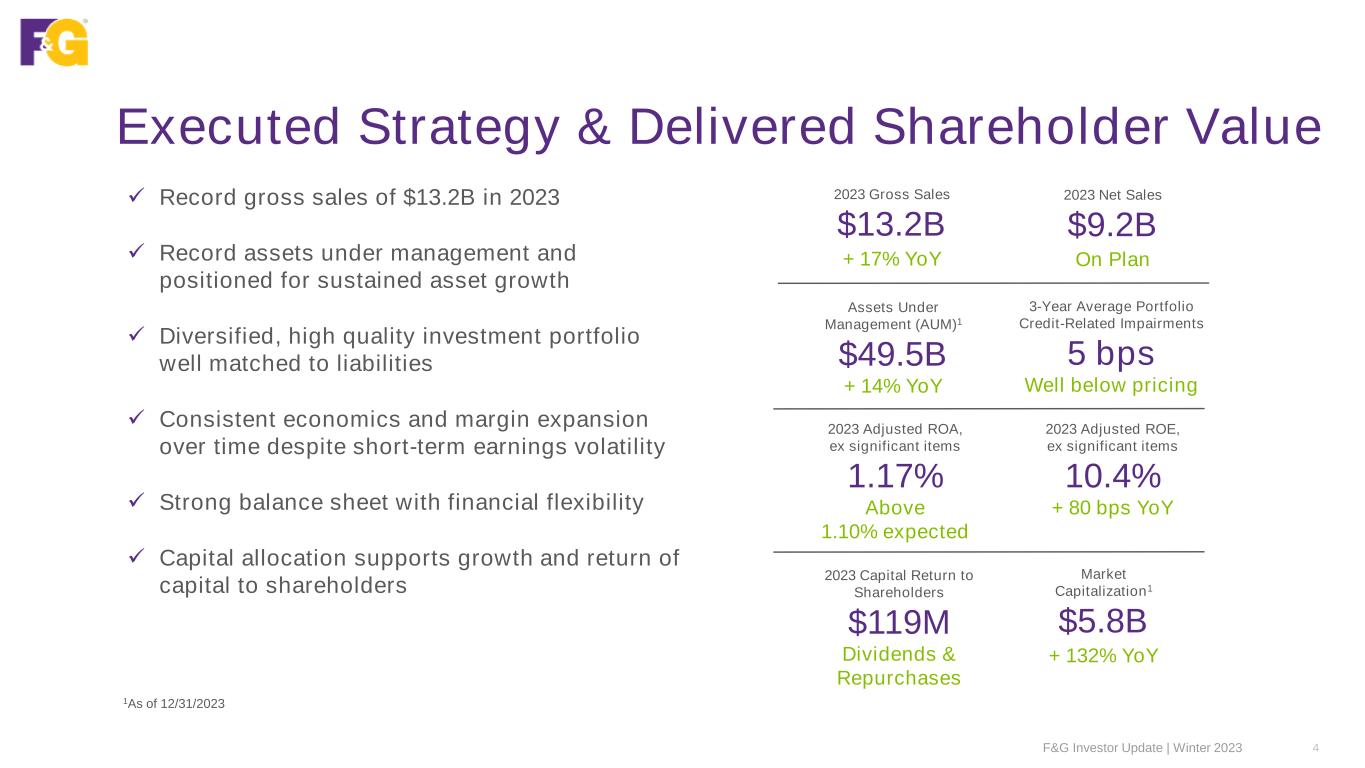 Non-GAAP Financial Measures Generally Accepted Accounting Principles (GAAP) is the term used to refer to the standard framework of guidelines for financial accounting. GAAP includes the standards, conventions, and rules accountants follow in recording and summarizing transactions and in the preparation of financial statements. In addition to reporting financial results in accordance with GAAP, this presentation includes non-GAAP financial measures, which the Company believes are useful to help investors better understand its financial performance, competitive position and prospects for the future. Management believes these non-GAAP financial measures may be useful in certain instances to provide additional meaningful comparisons between current results and results in prior operating periods. Our non-GAAP measures may not be comparable to similarly titled measures of other organizations because other organizations may not calculate such non-GAAP measures in the same manner as we do. The presentation of this financial information is not intended to be considered in isolation of or as a substitute for, or superior to, the financial information prepared and presented in accordance with GAAP. By disclosing these non-GAAP financial measures, the Company believes it offers investors a greater understanding of, and an enhanced level of transparency into, the means by which the Company’s management operates the Company. Any non-GAAP measures should be considered in context with the GAAP financial presentation and should not be considered in isolation or as a substitute for GAAP net earnings, net earnings attributable to common shareholders, or any other measures derived in accordance with GAAP as measures of operating performance or liquidity. Reconciliations of these non-GAAP financial measures to the most directly comparable GAAP measures are provided within. F&G Investor Update | Winter 2023 3