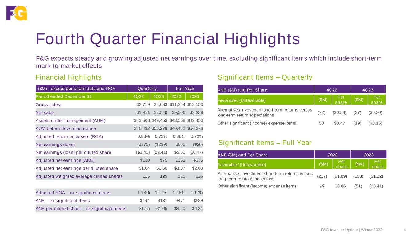 Executed Strategy & Delivered Shareholder Value ✓ Record gross sales of $13.2B in 2023 ✓ Record assets under management and positioned for sustained asset growth ✓ Diversified, high quality investment portfolio well matched to liabilities ✓ Consistent economics and margin expansion over time despite short-term earnings volatility ✓ Strong balance sheet with financial flexibility ✓ Capital allocation supports growth and return of capital to shareholders F&G Investor Update | Winter 2023 4 2023 Gross Sales $13.2B + 17% YoY 2023 Net Sales $9.2B On Plan Assets Under Management (AUM)1 $49.5B + 14% YoY 3-Year Average Portfolio Credit-Related Impairments 5 bps Well below pricing 2023 Adjusted ROA, ex significant items 1.17% Above 1.10% expected 2023 Capital Return to Shareholders $119M Dividends & Repurchases Market Capitalization1 $5.8B + 132% YoY 1As of 12/31/2023 2023 Adjusted ROE, ex significant items 10.4% + 80 bps YoY