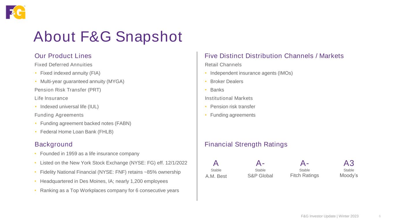 ($M) - except per share data and ROA Quarterly Full Year Period ended December 31 4Q22 4Q23 2022 2023 Gross sales $2,719 $4,083 $11,254 $13,153 Net sales $1,911 $2,549 $9,006 $9,238 Assets under management (AUM) $43,568 $49,453 $43,568 $49,453 AUM before flow reinsurance $46,432 $56,278 $46,432 $56,278 Adjusted return on assets (ROA) 0.88% 0.72% 0.88% 0.72% Net earnings (loss) ($176) ($299) $635 ($58) Net earnings (loss) per diluted share ($1.41) ($2.41) $5.52 ($0.47) Adjusted net earnings (ANE) $130 $75 $353 $335 Adjusted net earnings per diluted share $1.04 $0.60 $3.07 $2.68 Adjusted weighted average diluted shares 125 125 115 125 Adjusted ROA – ex significant items 1.18% 1.17% 1.18% 1.17% ANE – ex significant items $144 $131 $471 $539 ANE per diluted share – ex significant items $1.15 $1.05 $4.10 $4.31 Fourth Quarter Financial Highlights F&G expects steady and growing adjusted net earnings over time, excluding significant items which include short-term mark-to-market effects F&G Investor Update | Winter 2023 5 ANE ($M) and Per Share 4Q22 4Q23 Favorable / (Unfavorable) ($M) Per share ($M) Per share Alternatives investment short-term returns versus long-term return expectations (72) ($0.58) (37) ($0.30) Other significant (income) expense items 58 $0.47 (19) ($0.15) ANE ($M) and Per Share 2022 2023 Favorable / (Unfavorable) ($M) Per share ($M) Per share Alternatives investment short-term returns versus long-term return expectations (217) ($1.89) (153) ($1.22) Other significant (income) expense items 99 $0.86 (51) ($0.41) Significant Items – Full Year Significant Items – Quarterly Financial Highlights