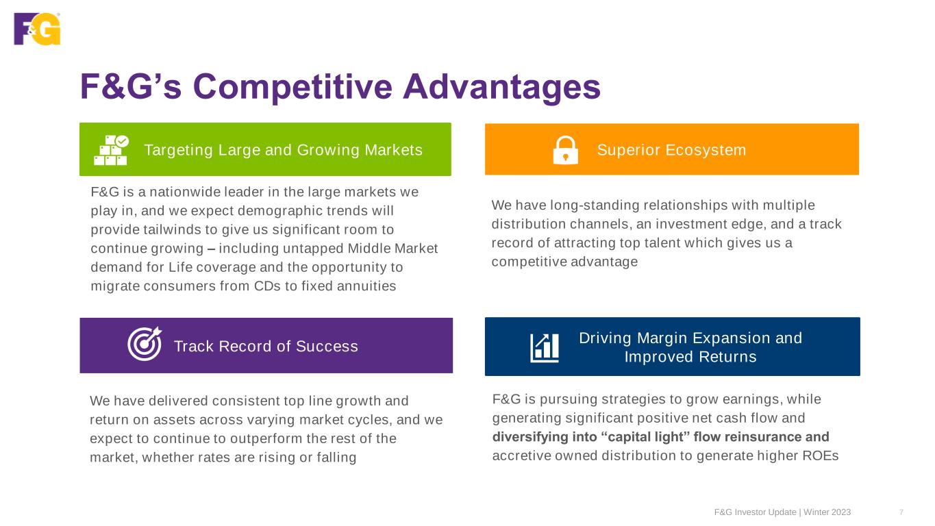About F&G Snapshot Our Product Lines Fixed Deferred Annuities • Fixed indexed annuity (FIA) • Multi-year guaranteed annuity (MYGA) Pension Risk Transfer (PRT) Life Insurance • Indexed universal life (IUL) Funding Agreements • Funding agreement backed notes (FABN) • Federal Home Loan Bank (FHLB) Background Five Distinct Distribution Channels / Markets Retail Channels • Independent insurance agents (IMOs) • Broker Dealers • Banks Institutional Markets • Pension risk transfer • Funding agreements Financial Strength Ratings A Stable A.M. Best A- Stable S&P Global A- Stable Fitch Ratings A3 Stable Moody’s F&G Investor Update | Winter 2023 6 • Founded in 1959 as a life insurance company • Listed on the New York Stock Exchange (NYSE: FG) eff. 12/1/2022 • Fidelity National Financial (NYSE: FNF) retains ~85% ownership • Headquartered in Des Moines, IA; nearly 1,200 employees • Ranking as a Top Workplaces company for 6 consecutive years