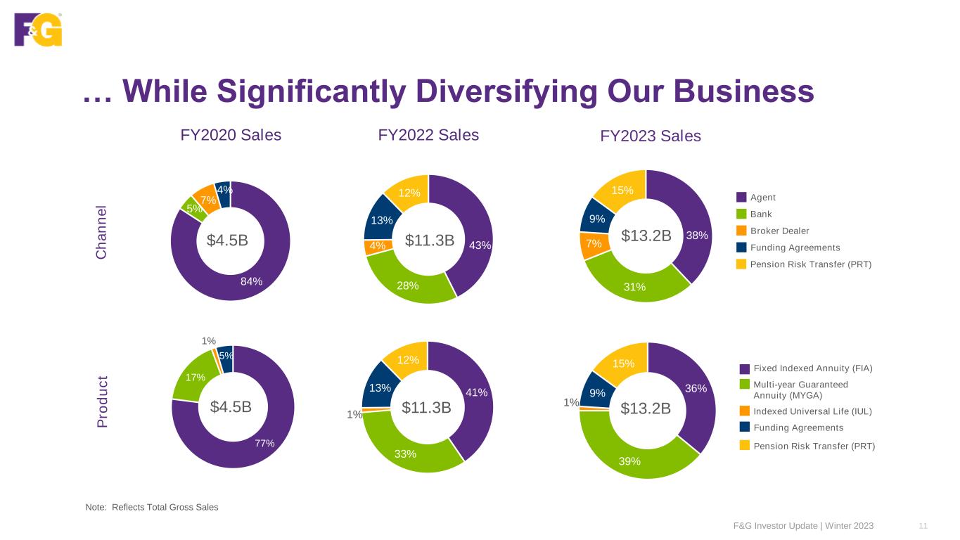 … And We’re Winning … Annual Gross Sales by Retail Channel and Institutional Market ($B) 1CAGR reflects 2018-2023 annual periods 2018 2019 2020 2021 2022 2023 Funding Agreements Agent PRT Broker Dealer Bank $9.6B $4.5B $3.9B $3.4B • FNF and F&G Merger • F&G ratings upgrades (June 2020) $11.3B ~31% CAGR1 10 $13.2B F&G Investor Update | Winter 2023