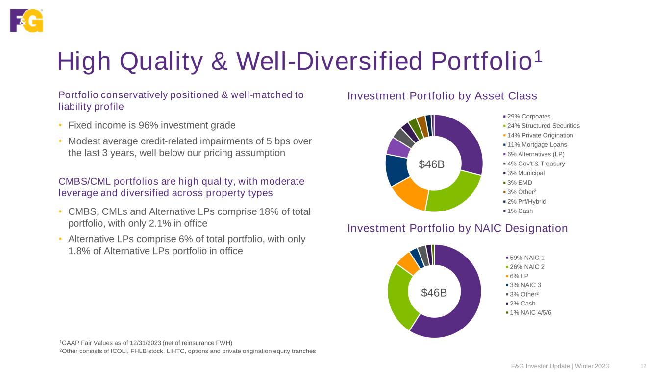 43% 28% 4% 13% 12% $11.3B 36% 39% 1% 9% 15% $13.2B 84% 5% 7% 4% $4.5B … While Significantly Diversifying Our Business Note: Reflects Total Gross Sales 38% 31% 7% 9% 15% $13.2B FY2022 Sales FY2023 Sales Bank Broker Dealer Agent Funding Agreements Pension Risk Transfer (PRT) C h a n n e l P ro d u c t Multi-year Guaranteed Annuity (MYGA) Indexed Universal Life (IUL) Funding Agreements Fixed Indexed Annuity (FIA) Pension Risk Transfer (PRT) 41% 33% 1% 13% 12% $11.3B 77% 17% 1% 5% $4.5B FY2020 Sales F&G Investor Update | Winter 2023 11
