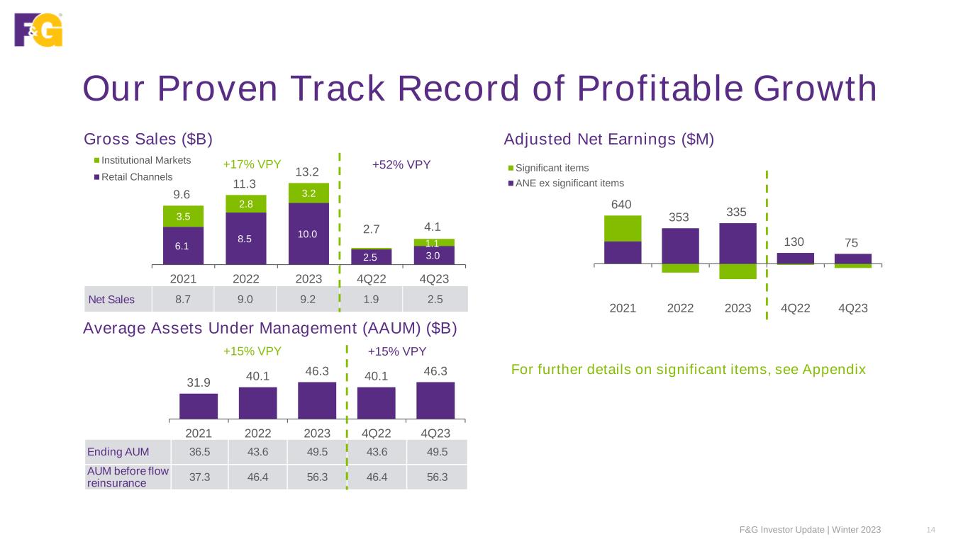 Structured Credit Portfolio1,2 58% Residential 20% Multifamily 10% Industrial 6% Office 2% Retail 2% Student Housing 2% Other³ Our Investment Portfolio Key Attributes Investment Rationale • Core fixed income: Focus remains high grade public and private securities with strong risk adjusted returns • Structured credit: Provides access to well diversified, high- quality assets across CLOs, CMBS and ABS • Mortgage loans: Superior loss-adjusted performance relative to similar rated corporates • Direct Origination: Diversified private credit exposure to a wide spectrum of underlying collateral Fixed Income1,2 (ex. Structured, Mortgage Loan & Private Origination) Private Origination Portfolio1,2 1GAAP Fair Values as of 12/31/2023 (net of reinsurance FWH) 2Excludes $4.6B of alternatives/equity, FHLB, call options and cash 3Other consists of data center, mixed use and hotel properties 70% Corporates 9% Municipal 9% Gov't & Treasury 6% Prf/Hybrid 6% EMD $19B 40% CLOs 32% CMBS 14% Non Agency RMBS 13% ABS 1% Agency RMBS $11B Mortgage Loans1,2 $5B 47% Corporate Lending 26% Private Specialty Finance 23% Asset Backed & Consumer Loans 4% Triple Net Lease $7B F&G Investor Update | Winter 2023 13
