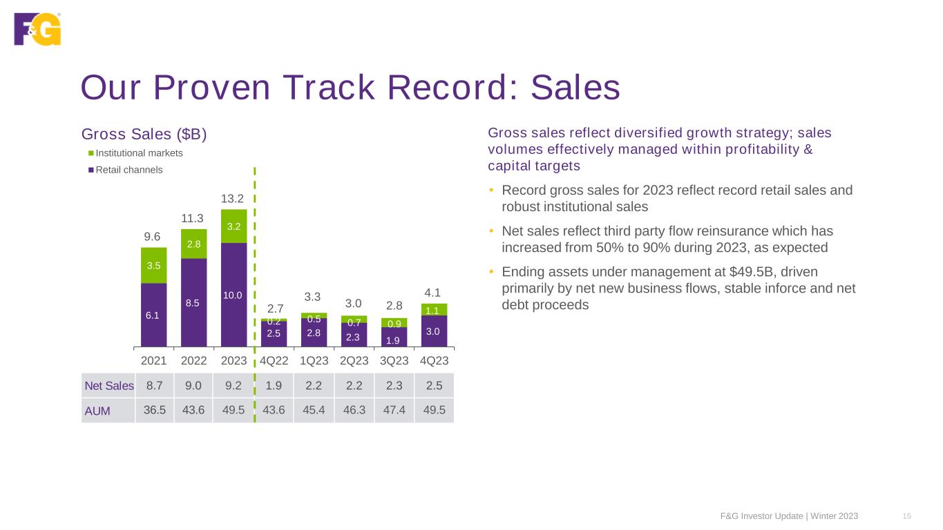 Our Proven Track Record of Profitable Growth Gross Sales ($B) Average Assets Under Management (AAUM) ($B) Adjusted Net Earnings ($M) 6.1 8.5 10.0 2.5 3.0 3.5 2.8 3.2 1.1 9.6 11.3 13.2 2.7 4.1 2021 2022 2023 4Q22 4Q23 Institutional Markets Retail Channels Net Sales 8.7 9.0 9.2 1.9 2.5 +52% VPY+17% VPY 31.9 40.1 46.3 40.1 46.3 2021 2022 2023 4Q22 4Q23 +15% VPY+15% VPY Ending AUM 36.5 43.6 49.5 43.6 49.5 AUM before flow reinsurance 37.3 46.4 56.3 46.4 56.3 F&G Investor Update | Winter 2023 14 640 353 335 130 75 2021 2022 2023 4Q22 4Q23 Significant items ANE ex significant items For further details on significant items, see Appendix
