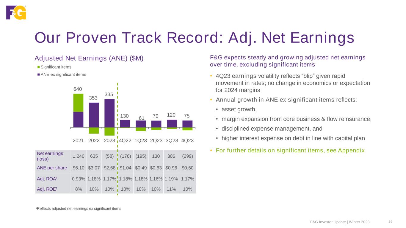 Our Proven Track Record: Sales Gross Sales ($B) Gross sales reflect diversified growth strategy; sales volumes effectively managed within profitability & capital targets • Record gross sales for 2023 reflect record retail sales and robust institutional sales • Net sales reflect third party flow reinsurance which has increased from 50% to 90% during 2023, as expected • Ending assets under management at $49.5B, driven primarily by net new business flows, stable inforce and net debt proceeds 6.1 8.5 10.0 2.5 2.8 2.3 1.9 3.0 3.5 2.8 3.2 0.2 0.5 0.7 0.9 1.1 9.6 11.3 13.2 2.7 3.3 3.0 2.8 4.1 2021 2022 2023 4Q22 1Q23 2Q23 3Q23 4Q23 Institutional markets Retail channels Net Sales 8.7 9.0 9.2 1.9 2.2 2.2 2.3 2.5 AUM 36.5 43.6 49.5 43.6 45.4 46.3 47.4 49.5 F&G Investor Update | Winter 2023 15