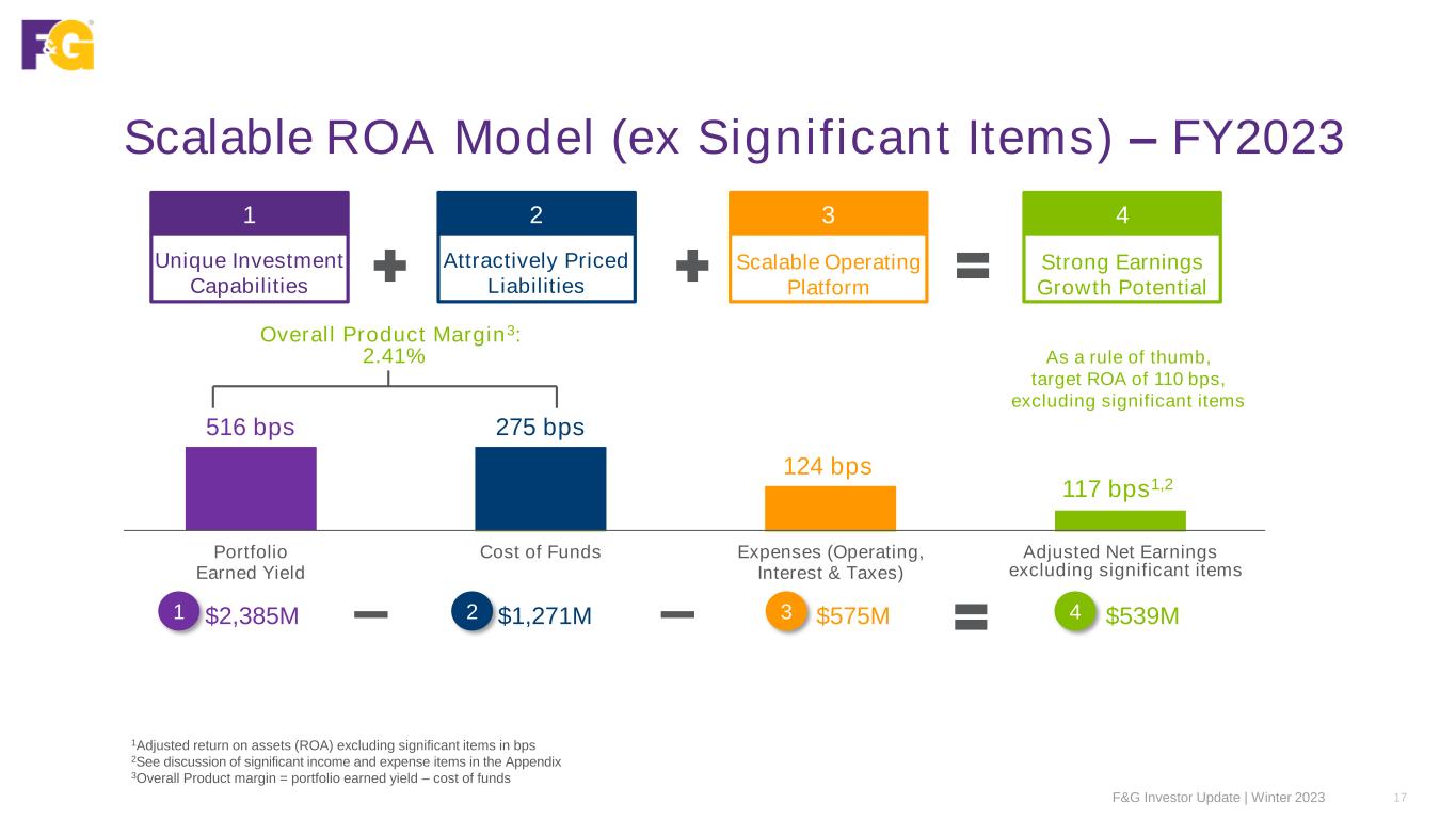 640 353 335 130 61 79 120 75 2021 2022 2023 4Q22 1Q23 2Q23 3Q23 4Q23 Significant items ANE ex significant items Our Proven Track Record: Adj. Net Earnings 16F&G Investor Update | Winter 2023 Adjusted Net Earnings (ANE) ($M) Net earnings (loss) 1,240 635 (58) (176) (195) 130 306 (299) ANE per share $6.10 $3.07 $2.68 $1.04 $0.49 $0.63 $0.96 $0.60 Adj. ROA1 0.93% 1.18% 1.17% 1.18% 1.18% 1.16% 1.19% 1.17% Adj. ROE1 8% 10% 10% 10% 10% 10% 11% 10% 1Reflects adjusted net earnings ex significant items F&G expects steady and growing adjusted net earnings over time, excluding significant items • 4Q23 earnings volatility reflects “blip” given rapid movement in rates; no change in economics or expectation for 2024 margins • Annual growth in ANE ex significant items reflects: • asset growth, • margin expansion from core business & flow reinsurance, • disciplined expense management, and • higher interest expense on debt in line with capital plan • For further details on significant items, see Appendix
