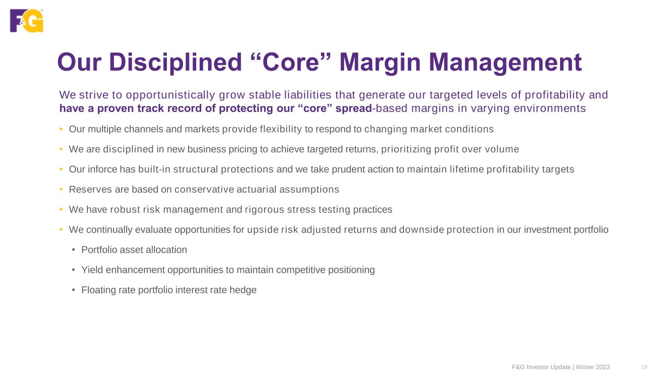Scalable ROA Model (ex Significant Items) – FY2023 516 bps 275 bps 124 bps 117 bps1,2 Portfolio Earned Yield Cost of Funds Expenses (Operating, Interest & Taxes) Adjusted Net Earnings excluding significant items Unique Investment Capabilities Attractively Priced Liabilities Scalable Operating Platform Strong Earnings Growth Potential Overall Product Margin3: 2.41% 4 $539M 1 2 3 4 As a rule of thumb, target ROA of 110 bps, excluding significant items 1 2 3$2,385M $1,271M $575M F&G Investor Update | Winter 2023 17 1Adjusted return on assets (ROA) excluding significant items in bps 2See discussion of significant income and expense items in the Appendix 3Overall Product margin = portfolio earned yield – cost of funds