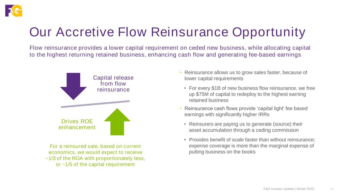 Our Disciplined “Core” Margin Management We strive to opportunistically grow stable liabilities that generate our targeted levels of profitability and have a proven track record of protecting our “core” spread-based margins in varying environments • Our multiple channels and markets provide flexibility to respond to changing market conditions • We are disciplined in new business pricing to achieve targeted returns, prioritizing profit over volume • Our inforce has built-in structural protections and we take prudent action to maintain lifetime profitability targets • Reserves are based on conservative actuarial assumptions • We have robust risk management and rigorous stress testing practices • We continually evaluate opportunities for upside risk adjusted returns and downside protection in our investment portfolio • Portfolio asset allocation • Yield enhancement opportunities to maintain competitive positioning • Floating rate portfolio interest rate hedge F&G Investor Update | Winter 2023 18