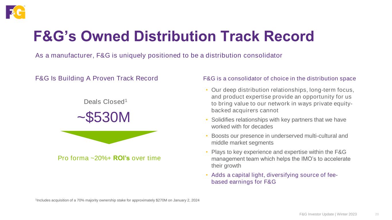 Our Accretive Flow Reinsurance Opportunity Flow reinsurance provides a lower capital requirement on ceded new business, while allocating capital to the highest returning retained business, enhancing cash flow and generating fee-based earnings Capital release from flow reinsurance Drives ROE enhancement For a reinsured sale, based on current economics, we would expect to receive ~1/3 of the ROA with proportionately less, or ~1/5 of the capital requirement F&G Investor Update | Winter 2023 19 • Reinsurance allows us to grow sales faster, because of lower capital requirements • For every $1B of new business flow reinsurance, we free up $75M of capital to redeploy to the highest earning retained business • Reinsurance cash flows provide ‘capital light’ fee based earnings with significantly higher IRRs • Reinsurers are paying us to generate (source) their asset accumulation through a ceding commission • Provides benefit of scale faster than without reinsurance; expense coverage is more than the marginal expense of putting business on the books