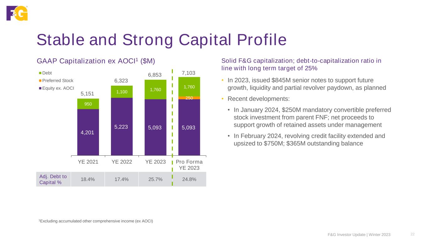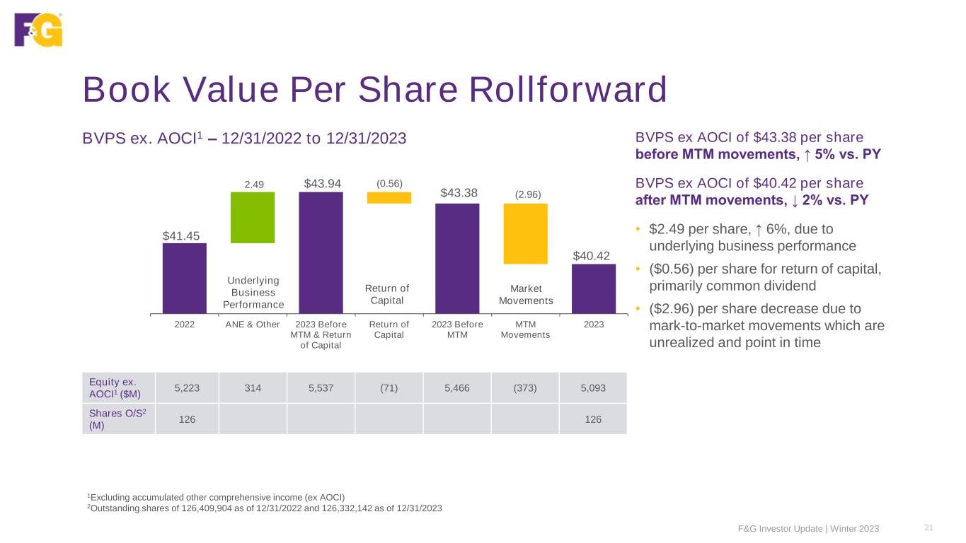 Book Value Per Share Rollforward 21F&G Investor Update | Winter 2023 BVPS ex. AOCI1 – 12/31/2022 to 12/31/2023 $41.45 $43.94 $43.38 $40.42 2.49 (0.56) (2.96) $38.00 $39.00 $40.00 $41.00 $42.00 $43.00 $44.00 $45.00 2022 ANE & Other 2023 Before MTM & Return of Capital Return of Capital 2023 Before MTM MTM Movements 2023 Equity ex. AOCI1 ($M) 5,223 314 5,537 (71) 5,466 (373) 5,093 Shares O/S2 (M) 126 126 1Excluding accumulated other comprehensive income (ex AOCI) 2Outstanding shares of 126,409,904 as of 12/31/2022 and 126,332,142 as of 12/31/2023 Underlying Business Performance Market Movements Return of Capital BVPS ex AOCI of $43.38 per share before MTM movements, ↑ 5% vs. PY BVPS ex AOCI of $40.42 per share after MTM movements, ↓ 2% vs. PY • $2.49 per share, ↑ 6%, due to underlying business performance • ($0.56) per share for return of capital, primarily common dividend • ($2.96) per share decrease due to mark-to-market movements which are unrealized and point in time