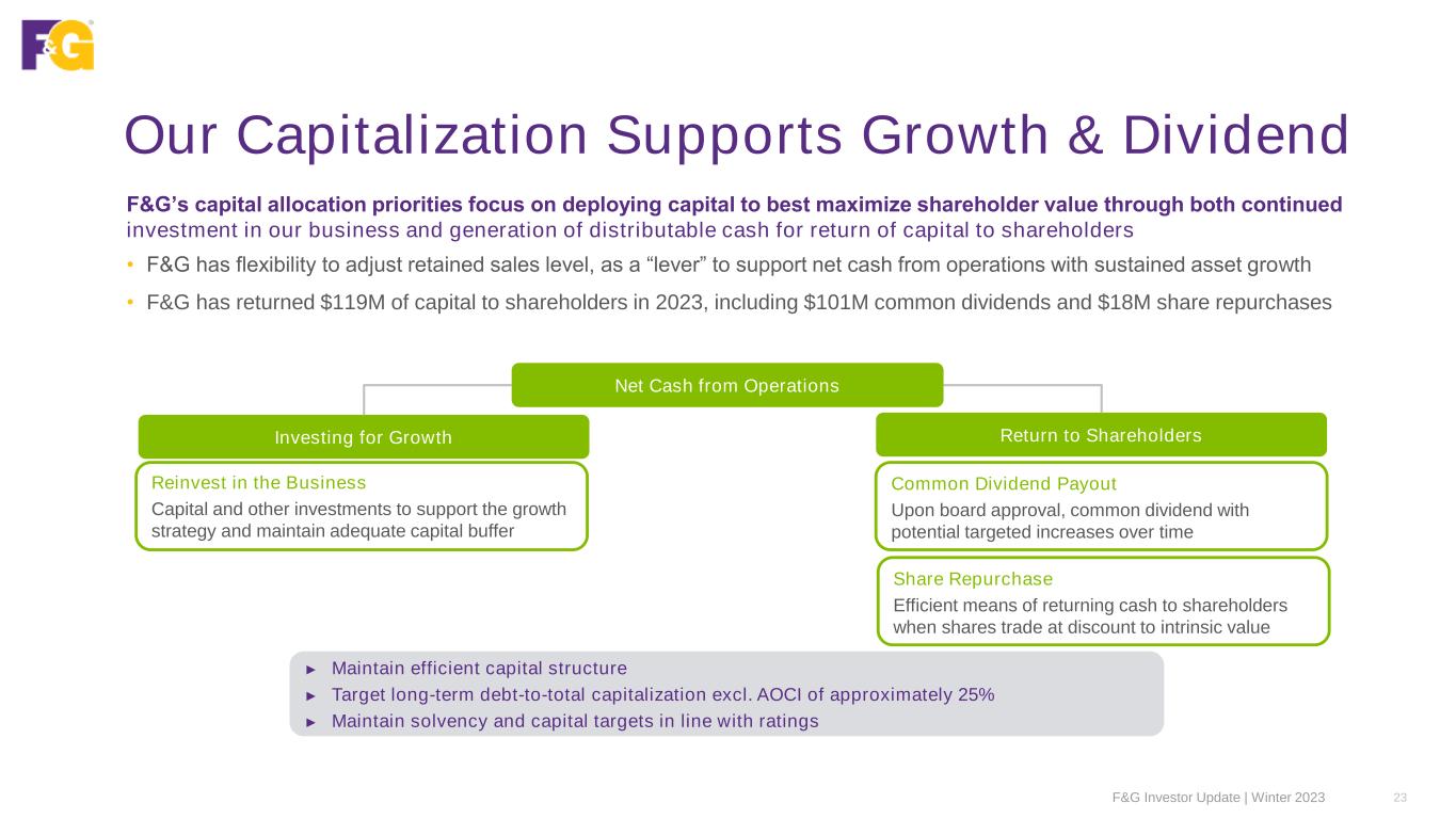 Stable and Strong Capital Profile 22F&G Investor Update | Winter 2023 GAAP Capitalization ex AOCI1 ($M) 4,201 5,223 5,093 5,093 250 950 1,100 1,760 1,760 5,151 6,323 6,853 7,103 YE 2021 YE 2022 YE 2023 Pro Forma YE 2023 Debt Preferred Stock Equity ex. AOCI Adj. Debt to Capital % 18.4% 17.4% 25.7% 24.8% 1Excluding accumulated other comprehensive income (ex AOCI) Solid F&G capitalization; debt-to-capitalization ratio in line with long term target of 25% • In 2023, issued $845M senior notes to support future growth, liquidity and partial revolver paydown, as planned • Recent developments: • In January 2024, $250M mandatory convertible preferred stock investment from parent FNF; net proceeds to support growth of retained assets under management • In February 2024, revolving credit facility extended and upsized to $750M; $365M outstanding balance