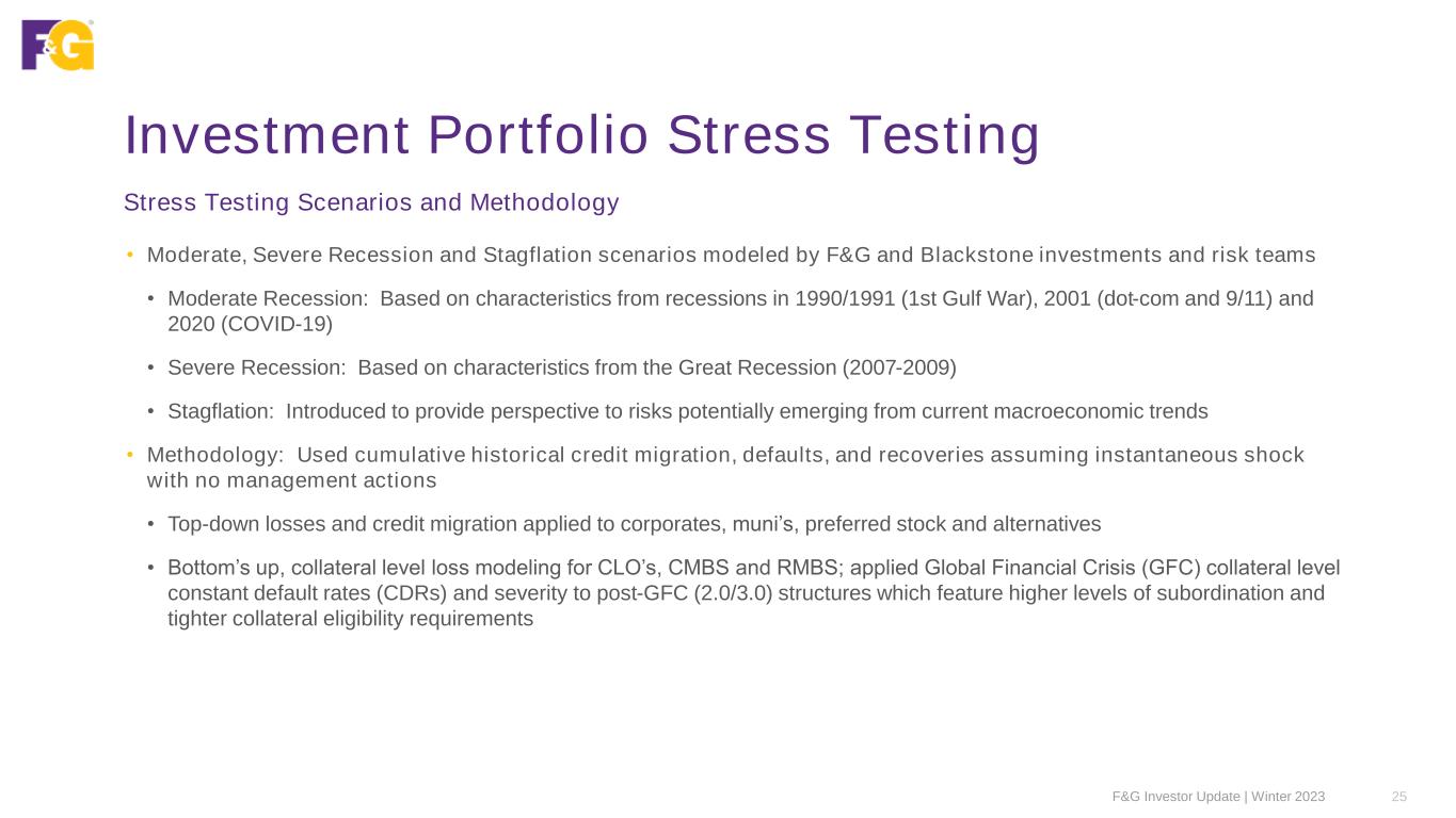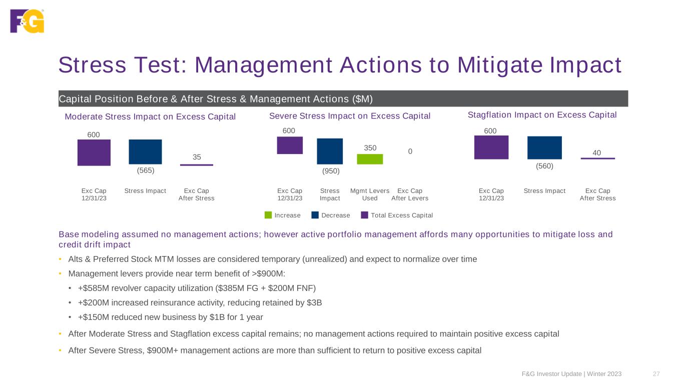 Stress Test: Results & No Management Actions 26F&G Investor Update | Winter 2023 Stress Test Scenario Results by Asset Class 1Reflects fixed income other than temporary impairment (OTTI) Before Stress Test, excess capital at 350% RBC is $600M Moderate Recession Severe Recession Stagflation 4Q23 Portfolio Allocation Stat Loss ($M) Loss % per Asset Class Stat Loss ($M) Loss % per Asset Class Stat Loss ($M) Loss % per Asset Class Corporates & Municipals (OTTI) 40% (48) -0.3% (100) -0.6% (48) -0.3% Structured Assets (CLO/ABS) (OTTI) 29% (27) -0.2% (41) -0.3% (27) -0.2% Commercial Mortgages (CML/CMBS) (OTTI) 13% (9) -0.2% (19) -0.3% (9) -0.2% Residential Mortgages (RML/RMBS) (OTTI) 11% (21) -0.5% (42) -0.9% (21) -0.5% Subtotal Fixed Income1 93% (105) -0.3% (202) -0.5% (105) -0.3% Alternative MTM 6% (523) -20.3% (697) -27.1% (517) -20.1% Preferred Stock MTM 1% (34) -7.0% (69) -14.4% (34) -7.0% Subtotal Equity 7% (557) -18.2% (766) -25.1% (551) -18.0% Total (662) -1.5% (968) -2.2% (656) -1.5% Incremental Required Capital Impacts (Credit Drift @ 350) 97 0.2% 18 0.0% 96 0.2% Total Impact on Excess Capital (565) -1.3% (950) -2.1% (560) -1.3% • Impact of default losses & credit drift are mitigated by reduced required capital from lower alternative asset market value and improved covariance benefit • Mark-to-market (MTM) impact on alternatives is unrealized and would be expected to recover over time, consistent with historical and recent experience • The stress scenarios assume an instantaneous shock on 12/31/23 investment portfolio, with no additional earnings on the underlying inforce block