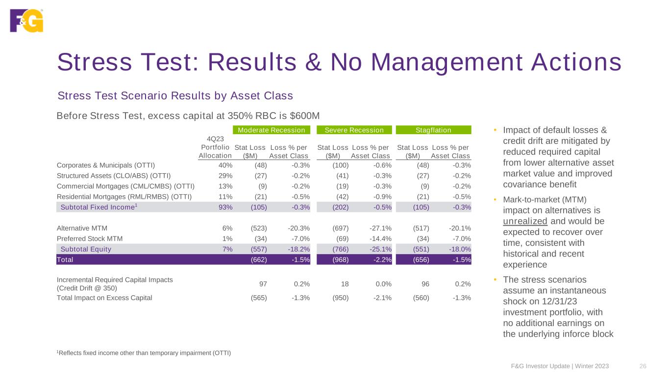 Investment Portfolio Stress Testing 25F&G Investor Update | Winter 2023 • Moderate, Severe Recession and Stagflation scenarios modeled by F&G and Blackstone investments and risk teams • Moderate Recession: Based on characteristics from recessions in 1990/1991 (1st Gulf War), 2001 (dot-com and 9/11) and 2020 (COVID-19) • Severe Recession: Based on characteristics from the Great Recession (2007-2009) • Stagflation: Introduced to provide perspective to risks potentially emerging from current macroeconomic trends • Methodology: Used cumulative historical credit migration, defaults, and recoveries assuming instantaneous shock with no management actions • Top-down losses and credit migration applied to corporates, muni’s, preferred stock and alternatives • Bottom’s up, collateral level loss modeling for CLO’s, CMBS and RMBS; applied Global Financial Crisis (GFC) collateral level constant default rates (CDRs) and severity to post-GFC (2.0/3.0) structures which feature higher levels of subordination and tighter collateral eligibility requirements Stress Testing Scenarios and Methodology