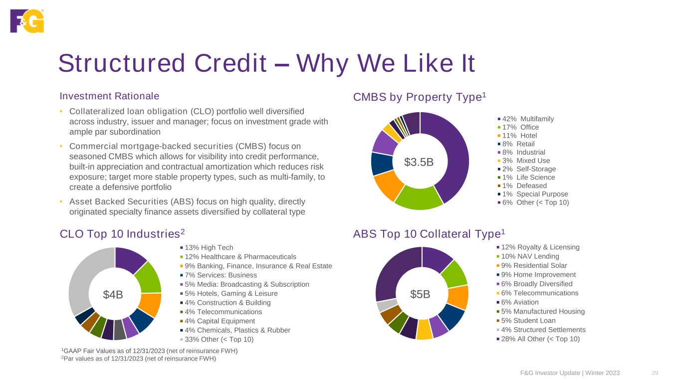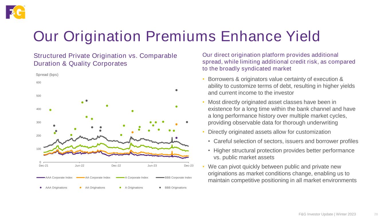 Our Origination Premiums Enhance Yield Our direct origination platform provides additional spread, while limiting additional credit risk, as compared to the broadly syndicated market • Borrowers & originators value certainty of execution & ability to customize terms of debt, resulting in higher yields and current income to the investor • Most directly originated asset classes have been in existence for a long time within the bank channel and have a long performance history over multiple market cycles, providing observable data for thorough underwriting • Directly originated assets allow for customization • Careful selection of sectors, issuers and borrower profiles • Higher structural protection provides better performance vs. public market assets • We can pivot quickly between public and private new originations as market conditions change, enabling us to maintain competitive positioning in all market environments Structured Private Origination vs. Comparable Duration & Quality Corporates F&G Investor Update | Winter 2023 28 Spread (bps) 0 100 200 300 400 500 600 Dec-21 Jun-22 Dec-22 Jun-23 Dec-23 AAA Corporate Index AA Corporate Index A Corporate Index BBB Corporate Index AAA Originations AA Originations A Originations BBB Originations