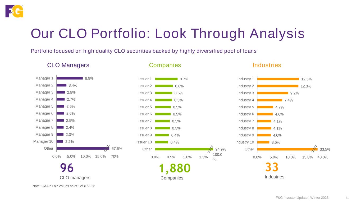 10% 11% 40% 29% 10% AAA AA A BBB BB and Below Portfolio Spotlight: CLO • Highly diversified portfolio with ample par subordination • Blackstone’s broad & deep understanding of the asset class, and ability to perform loan level underwriting, distinguishes F&G’s portfolio from its peers F&G CLO Portfolio Composition – % Fair Value Note: GAAP Fair Values as of 12/31/2023 1Reflects the weighted average par subordination of the CLO portfolio Investment Grade Par Subordination 41% 27% 19% 13% 7% Credit Quality 90% investment grade Structural Protection 20% par subordination1 Capital Efficiency 1.39 Average NAIC rating Market Value $4.3B CLO exposure 30F&G Investor Update | Winter 2023