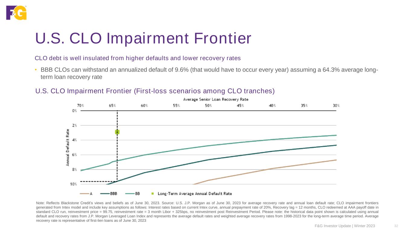 Our CLO Portfolio: Look Through Analysis Portfolio focused on high quality CLO securities backed by highly diversified pool of loans Note: GAAP Fair Values as of 12/31/2023 IndustriesCompaniesCLO Managers 96 CLO managers 1,880 Companies 33 Industries F&G Investor Update | Winter 2023 31 8.9% 3.4% 2.8% 2.7% 2.6% 2.6% 2.5% 2.4% 2.3% 2.2% 67.6% 0.0% 5.0% 10.0% 15.0% 20.0% Manager 1 Manager 2 Manager 3 Manager 4 Manager 5 Manager 6 Manager 7 Manager 8 Manager 9 Manager 10 Other 70% 0.7% 0.6% 0.5% 0.5% 0.5% 0.5% 0.5% 0.5% 0.4% 0.4% 94.9% 0.0% 0.5% 1.0% 1.5% 2.0% Issuer 1 Issuer 2 Issuer 3 Issuer 4 Issuer 5 Issuer 6 Issuer 7 Issuer 8 Issuer 9 Issuer 10 Other 100.0 % 12.5% 12.3% 9.2% 7.4% 4.7% 4.6% 4.1% 4.1% 4.0% 3.6% 33.5% 0.0% 5.0% 10.0% 15.0% 20.0% Industry 1 Industry 2 Industry 3 Industry 4 Industry 5 Industry 6 Industry 7 Industry 8 Industry 9 Industry 10 Other 40.0%