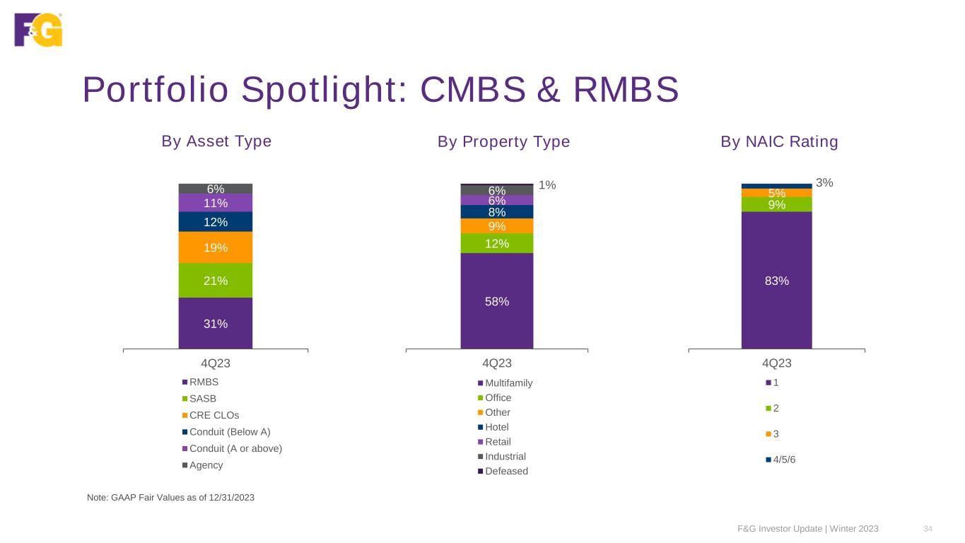 Portfolio Spotlight: Real Estate Debt Blackstone Real Estate Debt Strategies (BREDS) has assembled a high-quality portfolio with diversified exposure across asset classes and properties Note: GAAP Fair Values as of 12/31/2023 F&G Investor Update | Winter 2023 33 36% CMBS 27% RML 18% CML 16% RMBS 3% NNN $10B Duration 3.8 years Quality 1.4 Average NAIC rating Market Value $9.9B Real estate portfolio Weighted Average Life 5.7 years