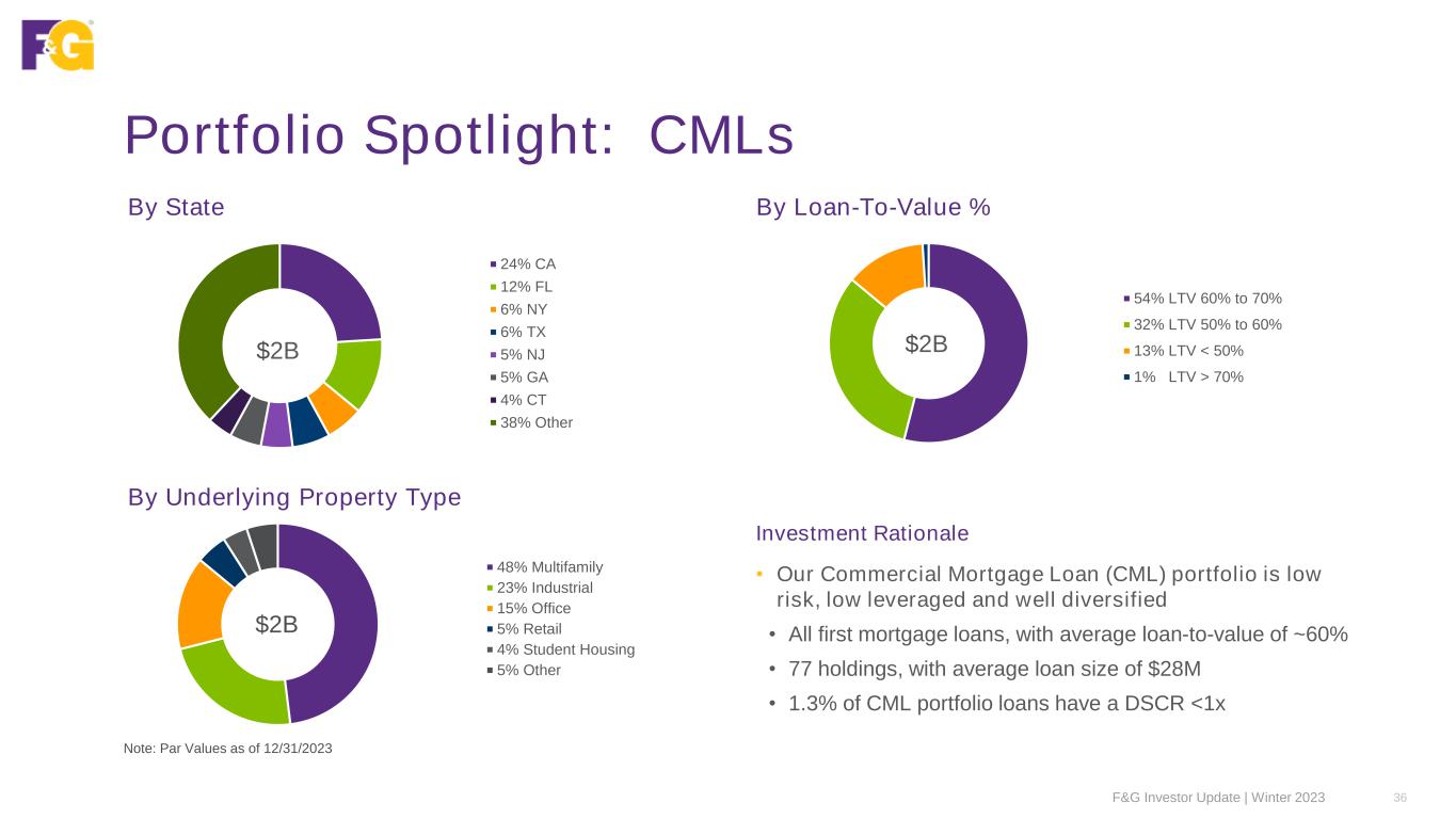 Portfolio Spotlight: CMBS Prudent asset selection has led to more multifamily exposure and less retail vs. Conduit CMBS market averages Portfolio Construction Comparison1 Note: GAAP Fair Values as of 12/31/2023 1BAML Conduit Data as of 12/31/2023 F&G Investor Update | Winter 2023 35 41% 8% 13% 25% Multifamily Retail F&G Post-Crisis Conduit CMBS Credit Quality 89% Investment grade (NRSRO) Quality 1.4 Average NAIC rating Market Value $3.5B CMBS portfolio Credit focus A NRSRO rating