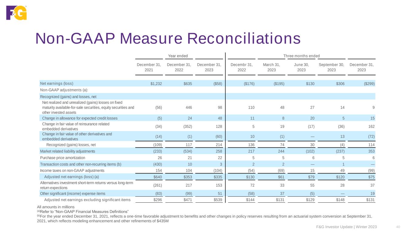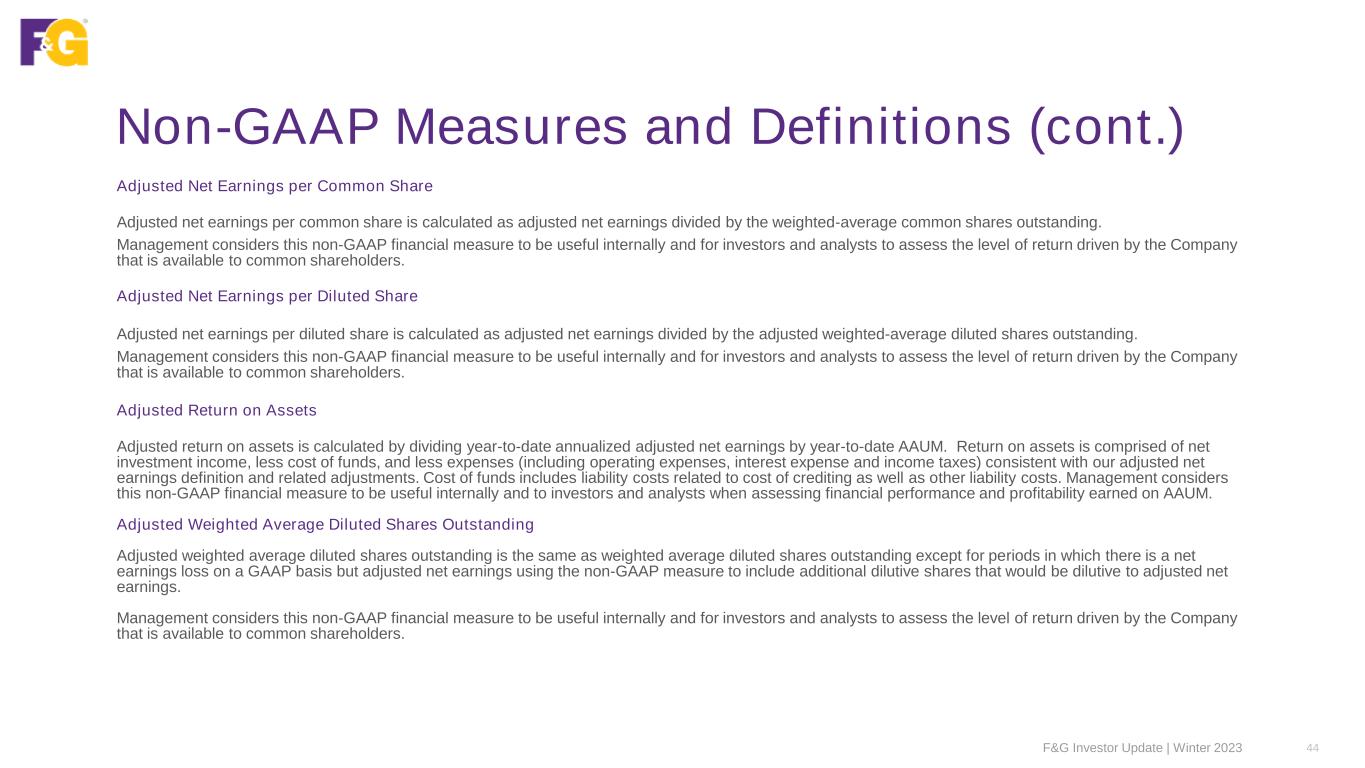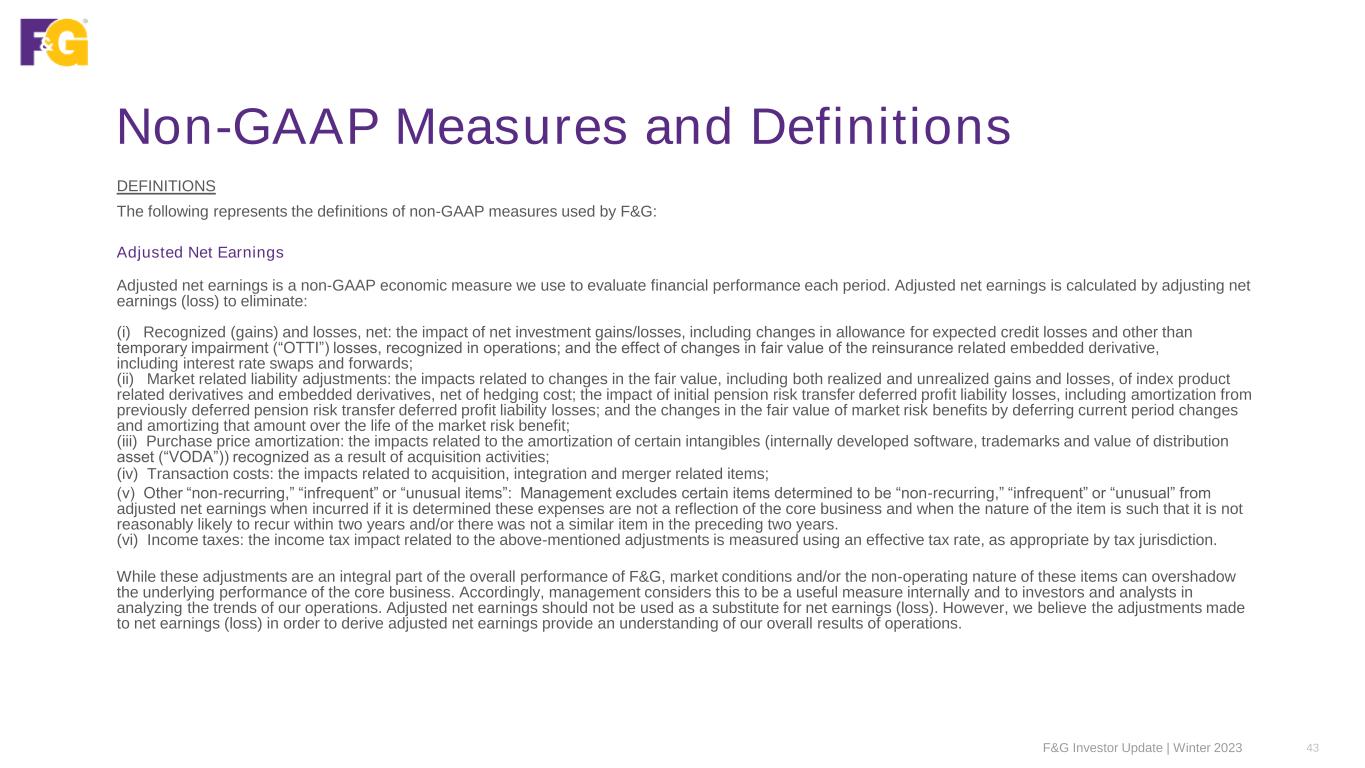 Non-GAAP Measures and Definitions F&G Investor Update | Winter 2023 43 DEFINITIONS The following represents the definitions of non-GAAP measures used by F&G: Adjusted Net Earnings Adjusted net earnings is a non-GAAP economic measure we use to evaluate financial performance each period. Adjusted net earnings is calculated by adjusting net earnings (loss) to eliminate: (i) Recognized (gains) and losses, net: the impact of net investment gains/losses, including changes in allowance for expected credit losses and other than temporary impairment (“OTTI”) losses, recognized in operations; and the effect of changes in fair value of the reinsurance related embedded derivative, including interest rate swaps and forwards; (ii) Market related liability adjustments: the impacts related to changes in the fair value, including both realized and unrealized gains and losses, of index product related derivatives and embedded derivatives, net of hedging cost; the impact of initial pension risk transfer deferred profit liability losses, including amortization from previously deferred pension risk transfer deferred profit liability losses; and the changes in the fair value of market risk benefits by deferring current period changes and amortizing that amount over the life of the market risk benefit; (iii) Purchase price amortization: the impacts related to the amortization of certain intangibles (internally developed software, trademarks and value of distribution asset (“VODA”)) recognized as a result of acquisition activities; (iv) Transaction costs: the impacts related to acquisition, integration and merger related items; (v) Other “non-recurring,” “infrequent” or “unusual items”: Management excludes certain items determined to be “non-recurring,” “infrequent” or “unusual” from adjusted net earnings when incurred if it is determined these expenses are not a reflection of the core business and when the nature of the item is such that it is not reasonably likely to recur within two years and/or there was not a similar item in the preceding two years. (vi) Income taxes: the income tax impact related to the above-mentioned adjustments is measured using an effective tax rate, as appropriate by tax jurisdiction. While these adjustments are an integral part of the overall performance of F&G, market conditions and/or the non-operating nature of these items can overshadow the underlying performance of the core business. Accordingly, management considers this to be a useful measure internally and to investors and analysts in analyzing the trends of our operations. Adjusted net earnings should not be used as a substitute for net earnings (loss). However, we believe the adjustments made to net earnings (loss) in order to derive adjusted net earnings provide an understanding of our overall results of operations.