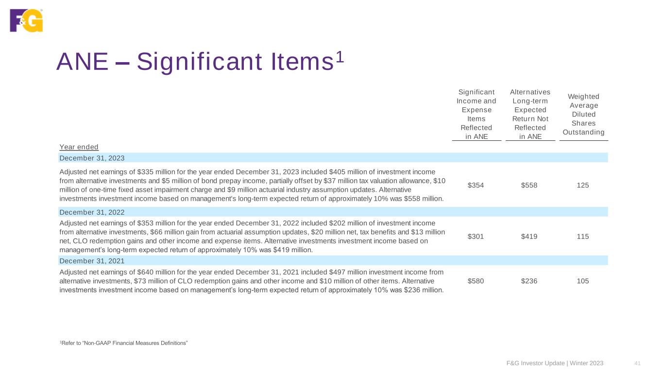 Non-GAAP Measure Reconciliations All amounts in millions (a)Refer to “Non-GAAP Financial Measures Definitions” (b)For the year ended December 31, 2021, reflects a one-time favorable adjustment to benefits and other changes in policy reserves resulting from an actuarial system conversion at September 31, 2021, which reflects modeling enhancement and other refinements of $435M F&G Investor Update | Winter 2023 40 Year ended Three months ended December 31, 2021 December 31, 2022 December 31, 2023 Decembr 31, 2022 March 31, 2023 June 30, 2023 September 30, 2023 December 31, 2023 Net earnings (loss) $1,232 $635 ($58) ($176) ($195) $130 $306 ($299) Non-GAAP adjustments (a): Recognized (gains) and losses, net Net realized and unrealized (gains) losses on fixed maturity available-for-sale securities, equity securities and other invested assets (56) 446 98 110 48 27 14 9 Change in allowance for expected credit losses (5) 24 48 11 8 20 5 15 Change in fair value of reinsurance related embedded derivatives (34) (352) 128 5 19 (17) (36) 162 Change in fair value of other derivatives and embedded derivatives (14) (1) (60) 10 (1) — 13 (72) Recognized (gains) losses, net (109) 117 214 136 74 30 (4) 114 Market related liability adjustments (233) (534) 258 217 244 (102) (237) 353 Purchase price amortization 26 21 22 5 5 6 5 6 Transaction costs and other non-recurring items (b) (430) 10 3 2 2 — 1 — Income taxes on non-GAAP adjustments 154 104 (104) (54) (69) 15 49 (99) Adjusted net earnings (loss) (a) $640 $353 $335 $130 $61 $79 $120 $75 Alternatives investment short-term returns versus long-term return expections (261) 217 153 72 33 55 28 37 Other significant (income) expense items (83) (99) 51 (58) 37 (5) — 19 Adjusted net earnings excluding significant items $296 $471 $539 $144 $131 $129 $148 $131
