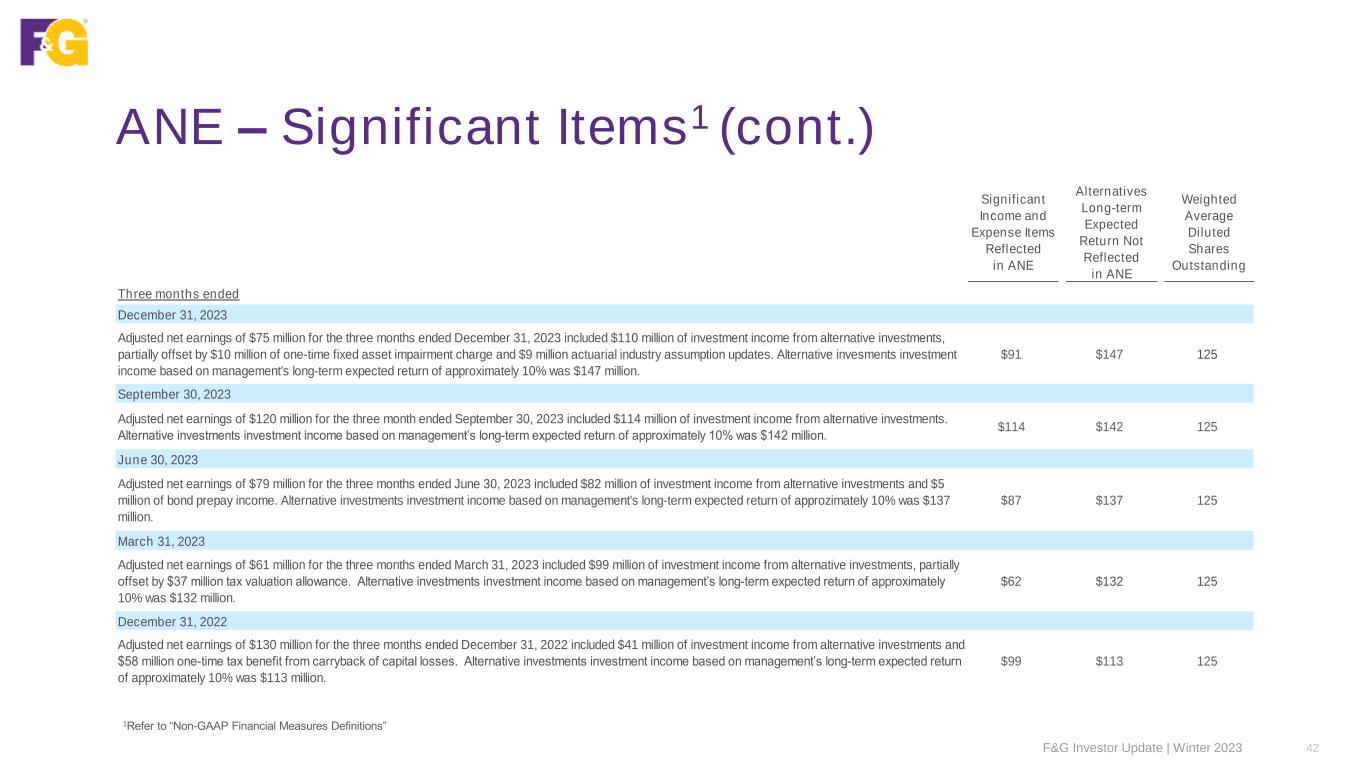 ANE – Significant Items1 1Refer to “Non-GAAP Financial Measures Definitions” F&G Investor Update | Winter 2023 41 Significant Income and Expense Items Reflected in ANE Alternatives Long-term Expected Return Not Reflected in ANE Weighted Average Diluted Shares Outstanding Year ended December 31, 2023 Adjusted net earnings of $335 million for the year ended December 31, 2023 included $405 million of investment income from alternative investments and $5 million of bond prepay income, partially offset by $37 million tax valuation allowance, $10 million of one-time fixed asset impairment charge and $9 million actuarial industry assumption updates. Alternative investments investment income based on management's long-term expected return of approximately 10% was $558 million. $354 $558 125 December 31, 2022 Adjusted net earnings of $353 million for the year ended December 31, 2022 included $202 million of investment income from alternative investments, $66 million gain from actuarial assumption updates, $20 million net, tax benefits and $13 million net, CLO redemption gains and other income and expense items. Alternative investments investment income based on management’s long-term expected return of approximately 10% was $419 million. $301 $419 115 December 31, 2021 Adjusted net earnings of $640 million for the year ended December 31, 2021 included $497 million investment income from alternative investments, $73 million of CLO redemption gains and other income and $10 million of other items. Alternative investments investment income based on management’s long-term expected return of approximately 10% was $236 million. $580 $236 105