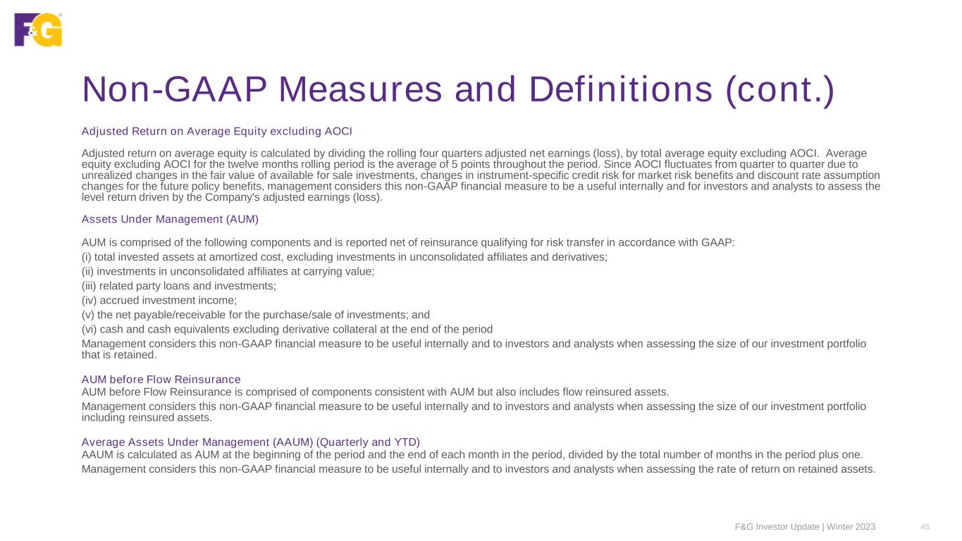 Non-GAAP Measures and Definitions (cont.) F&G Investor Update | Winter 2023 44 Adjusted Net Earnings per Common Share Adjusted net earnings per common share is calculated as adjusted net earnings divided by the weighted-average common shares outstanding. Management considers this non-GAAP financial measure to be useful internally and for investors and analysts to assess the level of return driven by the Company that is available to common shareholders. Adjusted Net Earnings per Diluted Share Adjusted net earnings per diluted share is calculated as adjusted net earnings divided by the adjusted weighted-average diluted shares outstanding. Management considers this non-GAAP financial measure to be useful internally and for investors and analysts to assess the level of return driven by the Company that is available to common shareholders. Adjusted Return on Assets Adjusted return on assets is calculated by dividing year-to-date annualized adjusted net earnings by year-to-date AAUM. Return on assets is comprised of net investment income, less cost of funds, and less expenses (including operating expenses, interest expense and income taxes) consistent with our adjusted net earnings definition and related adjustments. Cost of funds includes liability costs related to cost of crediting as well as other liability costs. Management considers this non-GAAP financial measure to be useful internally and to investors and analysts when assessing financial performance and profitability earned on AAUM. Adjusted Weighted Average Diluted Shares Outstanding Adjusted weighted average diluted shares outstanding is the same as weighted average diluted shares outstanding except for periods in which there is a net earnings loss on a GAAP basis but adjusted net earnings using the non-GAAP measure to include additional dilutive shares that would be dilutive to adjusted net earnings. Management considers this non-GAAP financial measure to be useful internally and for investors and analysts to assess the level of return driven by the Company that is available to common shareholders.