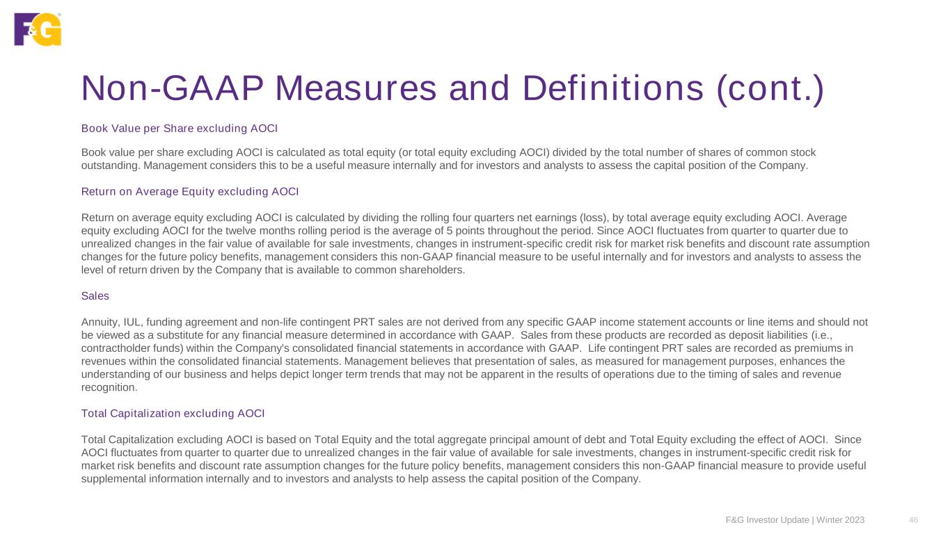 Non-GAAP Measures and Definitions (cont.) F&G Investor Update | Winter 2023 45 Adjusted Return on Average Equity excluding AOCI Adjusted return on average equity is calculated by dividing the rolling four quarters adjusted net earnings (loss), by total average equity excluding AOCI. Average equity excluding AOCI for the twelve months rolling period is the average of 5 points throughout the period. Since AOCI fluctuates from quarter to quarter due to unrealized changes in the fair value of available for sale investments, changes in instrument-specific credit risk for market risk benefits and discount rate assumption changes for the future policy benefits, management considers this non-GAAP financial measure to be a useful internally and for investors and analysts to assess the level return driven by the Company's adjusted earnings (loss). Assets Under Management (AUM) AUM is comprised of the following components and is reported net of reinsurance qualifying for risk transfer in accordance with GAAP: (i) total invested assets at amortized cost, excluding investments in unconsolidated affiliates and derivatives; (ii) investments in unconsolidated affiliates at carrying value; (iii) related party loans and investments; (iv) accrued investment income; (v) the net payable/receivable for the purchase/sale of investments; and (vi) cash and cash equivalents excluding derivative collateral at the end of the period Management considers this non-GAAP financial measure to be useful internally and to investors and analysts when assessing the size of our investment portfolio that is retained. AUM before Flow Reinsurance AUM before Flow Reinsurance is comprised of components consistent with AUM but also includes flow reinsured assets. Management considers this non-GAAP financial measure to be useful internally and to investors and analysts when assessing the size of our investment portfolio including reinsured assets. Average Assets Under Management (AAUM) (Quarterly and YTD) AAUM is calculated as AUM at the beginning of the period and the end of each month in the period, divided by the total number of months in the period plus one. Management considers this non-GAAP financial measure to be useful internally and to investors and analysts when assessing the rate of return on retained assets.