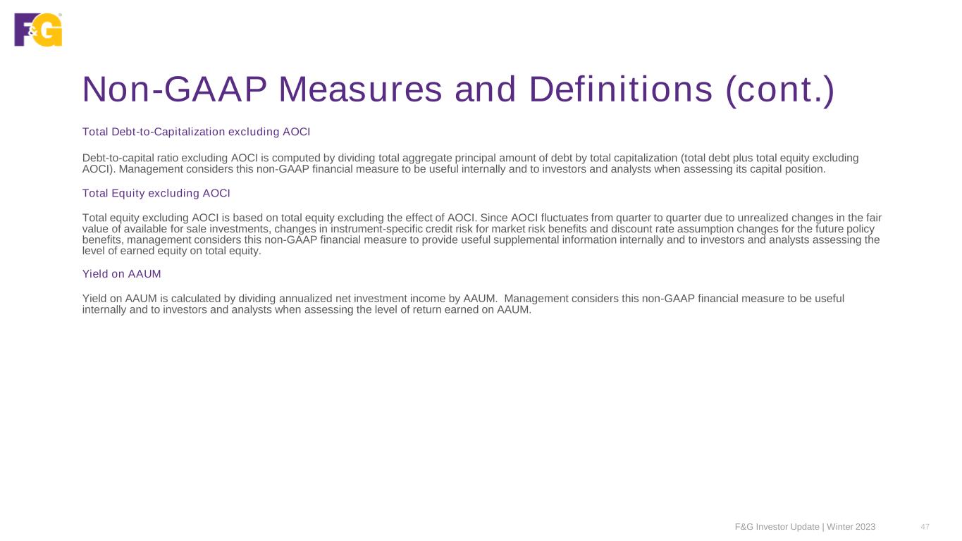 Non-GAAP Measures and Definitions (cont.) F&G Investor Update | Winter 2023 46 Book Value per Share excluding AOCI Book value per share excluding AOCI is calculated as total equity (or total equity excluding AOCI) divided by the total number of shares of common stock outstanding. Management considers this to be a useful measure internally and for investors and analysts to assess the capital position of the Company. Return on Average Equity excluding AOCI Return on average equity excluding AOCI is calculated by dividing the rolling four quarters net earnings (loss), by total average equity excluding AOCI. Average equity excluding AOCI for the twelve months rolling period is the average of 5 points throughout the period. Since AOCI fluctuates from quarter to quarter due to unrealized changes in the fair value of available for sale investments, changes in instrument-specific credit risk for market risk benefits and discount rate assumption changes for the future policy benefits, management considers this non-GAAP financial measure to be useful internally and for investors and analysts to assess the level of return driven by the Company that is available to common shareholders. Sales Annuity, IUL, funding agreement and non-life contingent PRT sales are not derived from any specific GAAP income statement accounts or line items and should not be viewed as a substitute for any financial measure determined in accordance with GAAP. Sales from these products are recorded as deposit liabilities (i.e., contractholder funds) within the Company's consolidated financial statements in accordance with GAAP. Life contingent PRT sales are recorded as premiums in revenues within the consolidated financial statements. Management believes that presentation of sales, as measured for management purposes, enhances the understanding of our business and helps depict longer term trends that may not be apparent in the results of operations due to the timing of sales and revenue recognition. Total Capitalization excluding AOCI Total Capitalization excluding AOCI is based on Total Equity and the total aggregate principal amount of debt and Total Equity excluding the effect of AOCI. Since AOCI fluctuates from quarter to quarter due to unrealized changes in the fair value of available for sale investments, changes in instrument-specific credit risk for market risk benefits and discount rate assumption changes for the future policy benefits, management considers this non-GAAP financial measure to provide useful supplemental information internally and to investors and analysts to help assess the capital position of the Company.