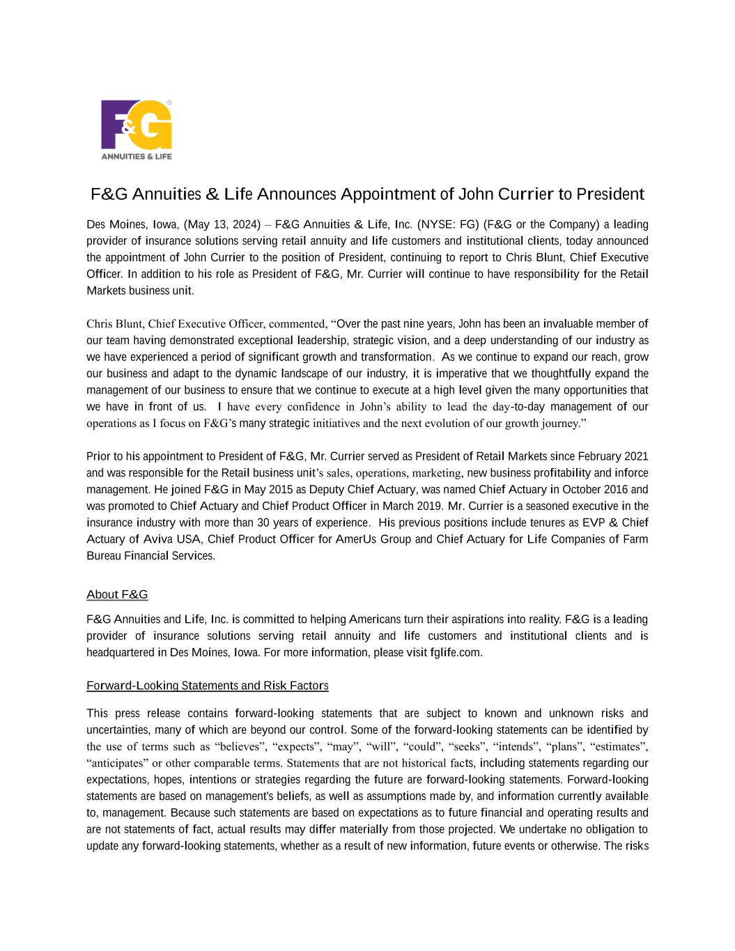 F&G Annuities & Life Announces Appointment of John Currier to President Des Moines, Iowa, (May 13, 2024) – F&G Annuities & Life, Inc. (NYSE: FG) (F&G or the Company) a leading provider of insurance solutions serving retail annuity and life customers and institutional clients, today announced the appointment of John Currier to the position of President, continuing to report to Chris Blunt, Chief Executive Officer. In addition to his role as President of F&G, Mr. Currier will continue to have responsibility for the Retail Markets business unit. Chris Blunt, Chief Executive Officer, commented, “Over the past nine years, John has been an invaluable member of our team having demonstrated exceptional leadership, strategic vision, and a deep understanding of our industry as we have experienced a period of significant growth and transformation. As we continue to expand our reach, grow our business and adapt to the dynamic landscape of our industry, it is imperative that we thoughtfully expand the management of our business to ensure that we continue to execute at a high level given the many opportunities that we have in front of us. I have every confidence in John’s ability to lead the day-to-day management of our operations as I focus on F&G’s many strategic initiatives and the next evolution of our growth journey.” Prior to his appointment to President of F&G, Mr. Currier served as President of Retail Markets since February 2021 and was responsible for the Retail business unit’s sales, operations, marketing, new business profitability and inforce management. He joined F&G in May 2015 as Deputy Chief Actuary, was named Chief Actuary in October 2016 and was promoted to Chief Actuary and Chief Product Officer in March 2019. Mr. Currier is a seasoned executive in the insurance industry with more than 30 years of experience. His previous positions include tenures as EVP & Chief Actuary of Aviva USA, Chief Product Officer for AmerUs Group and Chief Actuary for Life Companies of Farm Bureau Financial Services. About F&G F&G Annuities and Life, Inc. is committed to helping Americans turn their aspirations into reality. F&G is a leading provider of insurance solutions serving retail annuity and life customers and institutional clients and is headquartered in Des Moines, Iowa. For more information, please visit fglife.com. Forward-Looking Statements and Risk Factors This press release contains forward-looking statements that are subject to known and unknown risks and uncertainties, many of which are beyond our control. Some of the forward-looking statements can be identified by the use of terms such as “believes”, “expects”, “may”, “will”, “could”, “seeks”, “intends”, “plans”, “estimates”, “anticipates” or other comparable terms. Statements that are not historical facts, including statements regarding our expectations, hopes, intentions or strategies regarding the future are forward-looking statements. Forward-looking statements are based on management's beliefs, as well as assumptions made by, and information currently available to, management. Because such statements are based on expectations as to future financial and operating results and are not statements of fact, actual results may differ materially from those projected. We undertake no obligation to update any forward-looking statements, whether as a result of new information, future events or otherwise. The risks