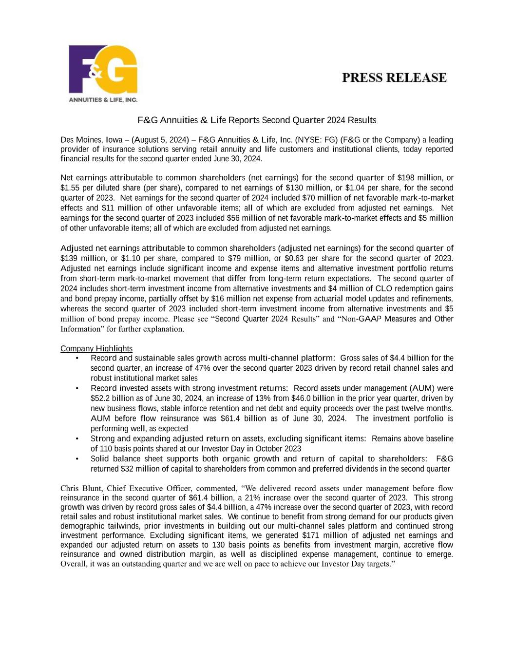 F&G Annuities & Life Reports Second Quarter 2024 Results Des Moines, Iowa – (August 5, 2024) – F&G Annuities & Life, Inc. (NYSE: FG) (F&G or the Company) a leading provider of insurance solutions serving retail annuity and life customers and institutional clients, today reported financial results for the second quarter ended June 30, 2024. Net earnings attributable to common shareholders (net earnings) for the second quarter of $198 million, or $1.55 per diluted share (per share), compared to net earnings of $130 million, or $1.04 per share, for the second quarter of 2023. Net earnings for the second quarter of 2024 included $70 million of net favorable mark-to-market effects and $11 million of other unfavorable items; all of which are excluded from adjusted net earnings. Net earnings for the second quarter of 2023 included $56 million of net favorable mark-to-market effects and $5 million of other unfavorable items; all of which are excluded from adjusted net earnings. Adjusted net earnings attributable to common shareholders (adjusted net earnings) for the second quarter of $139 million, or $1.10 per share, compared to $79 million, or $0.63 per share for the second quarter of 2023. Adjusted net earnings include significant income and expense items and alternative investment portfolio returns from short-term mark-to-market movement that differ from long-term return expectations. The second quarter of 2024 includes short-term investment income from alternative investments and $4 million of CLO redemption gains and bond prepay income, partially offset by $16 million net expense from actuarial model updates and refinements, whereas the second quarter of 2023 included short-term investment income from alternative investments and $5 million of bond prepay income. Please see “Second Quarter 2024 Results” and “Non-GAAP Measures and Other Information” for further explanation. Company Highlights • Record and sustainable sales growth across multi-channel platform: Gross sales of $4.4 billion for the second quarter, an increase of 47% over the second quarter 2023 driven by record retail channel sales and robust institutional market sales • Record invested assets with strong investment returns: Record assets under management (AUM) were $52.2 billion as of June 30, 2024, an increase of 13% from $46.0 billion in the prior year quarter, driven by new business flows, stable inforce retention and net debt and equity proceeds over the past twelve months. AUM before flow reinsurance was $61.4 billion as of June 30, 2024. The investment portfolio is performing well, as expected • Strong and expanding adjusted return on assets, excluding significant items: Remains above baseline of 110 basis points shared at our Investor Day in October 2023 • Solid balance sheet supports both organic growth and return of capital to shareholders: F&G returned $32 million of capital to shareholders from common and preferred dividends in the second quarter Chris Blunt, Chief Executive Officer, commented, “We delivered record assets under management before flow reinsurance in the second quarter of $61.4 billion, a 21% increase over the second quarter of 2023. This strong growth was driven by record gross sales of $4.4 billion, a 47% increase over the second quarter of 2023, with record retail sales and robust institutional market sales. We continue to benefit from strong demand for our products given demographic tailwinds, prior investments in building out our multi-channel sales platform and continued strong investment performance. Excluding significant items, we generated $171 million of adjusted net earnings and expanded our adjusted return on assets to 130 basis points as benefits from investment margin, accretive flow reinsurance and owned distribution margin, as well as disciplined expense management, continue to emerge. Overall, it was an outstanding quarter and we are well on pace to achieve our Investor Day targets.”