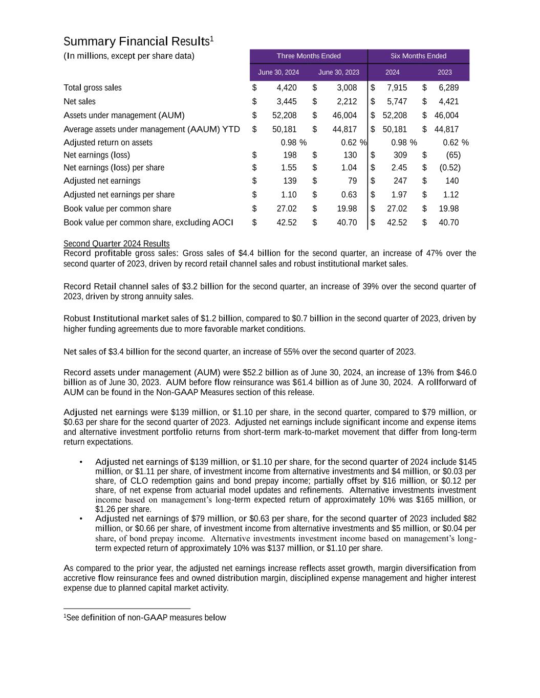 Summary Financial Results1 (In millions, except per share data) Three Months Ended Six Months Ended June 30, 2024 June 30, 2023 2024 2023 Total gross sales $ 4,420 $ 3,008 $ 7,915 $ 6,289 Net sales $ 3,445 $ 2,212 $ 5,747 $ 4,421 Assets under management (AUM) $ 52,208 $ 46,004 $ 52,208 $ 46,004 Average assets under management (AAUM) YTD $ 50,181 $ 44,817 $ 50,181 $ 44,817 Adjusted return on assets 0.98 % 0.62 % 0.98 % 0.62 % Net earnings (loss) $ 198 $ 130 $ 309 $ (65) Net earnings (loss) per share $ 1.55 $ 1.04 $ 2.45 $ (0.52) Adjusted net earnings $ 139 $ 79 $ 247 $ 140 Adjusted net earnings per share $ 1.10 $ 0.63 $ 1.97 $ 1.12 Book value per common share $ 27.02 $ 19.98 $ 27.02 $ 19.98 Book value per common share, excluding AOCI $ 42.52 $ 40.70 $ 42.52 $ 40.70 Second Quarter 2024 Results Record profitable gross sales: Gross sales of $4.4 billion for the second quarter, an increase of 47% over the second quarter of 2023, driven by record retail channel sales and robust institutional market sales. Record Retail channel sales of $3.2 billion for the second quarter, an increase of 39% over the second quarter of 2023, driven by strong annuity sales. Robust Institutional market sales of $1.2 billion, compared to $0.7 billion in the second quarter of 2023, driven by higher funding agreements due to more favorable market conditions. Net sales of $3.4 billion for the second quarter, an increase of 55% over the second quarter of 2023. Record assets under management (AUM) were $52.2 billion as of June 30, 2024, an increase of 13% from $46.0 billion as of June 30, 2023. AUM before flow reinsurance was $61.4 billion as of June 30, 2024. A rollforward of AUM can be found in the Non-GAAP Measures section of this release. Adjusted net earnings were $139 million, or $1.10 per share, in the second quarter, compared to $79 million, or $0.63 per share for the second quarter of 2023. Adjusted net earnings include significant income and expense items and alternative investment portfolio returns from short-term mark-to-market movement that differ from long-term return expectations. • Adjusted net earnings of $139 million, or $1.10 per share, for the second quarter of 2024 include $145 million, or $1.11 per share, of investment income from alternative investments and $4 million, or $0.03 per share, of CLO redemption gains and bond prepay income; partially offset by $16 million, or $0.12 per share, of net expense from actuarial model updates and refinements. Alternative investments investment income based on management’s long-term expected return of approximately 10% was $165 million, or $1.26 per share. • Adjusted net earnings of $79 million, or $0.63 per share, for the second quarter of 2023 included $82 million, or $0.66 per share, of investment income from alternative investments and $5 million, or $0.04 per share, of bond prepay income. Alternative investments investment income based on management’s long- term expected return of approximately 10% was $137 million, or $1.10 per share. As compared to the prior year, the adjusted net earnings increase reflects asset growth, margin diversification from accretive flow reinsurance fees and owned distribution margin, disciplined expense management and higher interest expense due to planned capital market activity. 1See definition of non-GAAP measures below