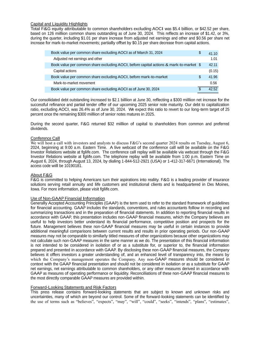 Capital and Liquidity Highlights Total F&G equity attributable to common shareholders excluding AOCI was $5.4 billion, or $42.52 per share, based on 126 million common shares outstanding as of June 30, 2024. This reflects an increase of $1.42, or 3%, during the quarter, including $1.01 per share increase from adjusted net earnings and other and $0.56 per share net increase for mark-to-market movements; partially offset by $0.15 per share decrease from capital actions. Book value per common share excluding AOCI as of March 31, 2024 $ 41.10 Adjusted net earnings and other 1.01 Book value per common share excluding AOCI, before capital actions & mark-to-market $ 42.11 Capital actions (0.15) Book value per common share excluding AOCI, before mark-to-market $ 41.96 Mark-to-market movement 0.56 Book value per common share excluding AOCI as of June 30, 2024 $ 42.52 Our consolidated debt outstanding increased to $2.1 billion at June 30, reflecting a $300 million net increase for the successful refinance and partial tender offer of our upcoming 2025 senior note maturity. Our debt to capitalization ratio, excluding AOCI, was 26.4% as of June 30, 2024. We expect this ratio to revert to our long-term target of 25 percent once the remaining $300 million of senior notes matures in 2025. During the second quarter, F&G returned $32 million of capital to shareholders from common and preferred dividends. Conference Call We will host a call with investors and analysts to discuss F&G’s second quarter 2024 results on Tuesday, August 6, 2024, beginning at 9:00 a.m. Eastern Time. A live webcast of the conference call will be available on the F&G Investor Relations website at fglife.com. The conference call replay will be available via webcast through the F&G Investor Relations website at fglife.com. The telephone replay will be available from 1:00 p.m. Eastern Time on August 6, 2024, through August 13, 2024, by dialing 1-844-512-2921 (USA) or 1-412-317-6671 (International). The access code will be 10190181. About F&G F&G is committed to helping Americans turn their aspirations into reality. F&G is a leading provider of insurance solutions serving retail annuity and life customers and institutional clients and is headquartered in Des Moines, Iowa. For more information, please visit fglife.com. Use of Non-GAAP Financial Information Generally Accepted Accounting Principles (GAAP) is the term used to refer to the standard framework of guidelines for financial accounting. GAAP includes the standards, conventions, and rules accountants follow in recording and summarizing transactions and in the preparation of financial statements. In addition to reporting financial results in accordance with GAAP, this presentation includes non-GAAP financial measures, which the Company believes are useful to help investors better understand its financial performance, competitive position and prospects for the future. Management believes these non-GAAP financial measures may be useful in certain instances to provide additional meaningful comparisons between current results and results in prior operating periods. Our non-GAAP measures may not be comparable to similarly titled measures of other organizations because other organizations may not calculate such non-GAAP measures in the same manner as we do. The presentation of this financial information is not intended to be considered in isolation of or as a substitute for, or superior to, the financial information prepared and presented in accordance with GAAP. By disclosing these non-GAAP financial measures, the Company believes it offers investors a greater understanding of, and an enhanced level of transparency into, the means by which the Company’s management operates the Company. Any non-GAAP measures should be considered in context with the GAAP financial presentation and should not be considered in isolation or as a substitute for GAAP net earnings, net earnings attributable to common shareholders, or any other measures derived in accordance with GAAP as measures of operating performance or liquidity. Reconciliations of these non-GAAP financial measures to the most directly comparable GAAP measures are provided within. Forward-Looking Statements and Risk Factors This press release contains forward-looking statements that are subject to known and unknown risks and uncertainties, many of which are beyond our control. Some of the forward-looking statements can be identified by the use of terms such as “believes”, “expects”, “may”, “will”, “could”, “seeks”, “intends”, “plans”, “estimates”,