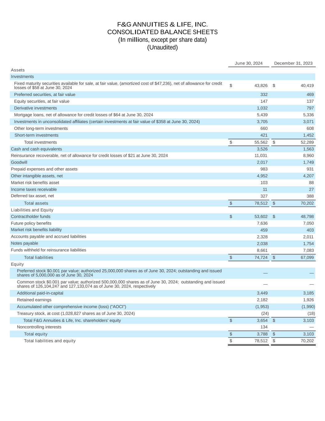 F&G ANNUITIES & LIFE, INC. CONSOLIDATED BALANCE SHEETS (In millions, except per share data) (Unaudited) June 30, 2024 December 31, 2023 Assets Investments Fixed maturity securities available for sale, at fair value, (amortized cost of $47,236), net of allowance for credit losses of $58 at June 30, 2024 $ 43,826 $ 40,419 Preferred securities, at fair value 332 469 Equity securities, at fair value 147 137 Derivative investments 1,032 797 Mortgage loans, net of allowance for credit losses of $64 at June 30, 2024 5,439 5,336 Investments in unconsolidated affiliates (certain investments at fair value of $358 at June 30, 2024) 3,705 3,071 Other long-term investments 660 608 Short-term investments 421 1,452 Total investments $ 55,562 $ 52,289 Cash and cash equivalents 3,526 1,563 Reinsurance recoverable, net of allowance for credit losses of $21 at June 30, 2024 11,031 8,960 Goodwill 2,017 1,749 Prepaid expenses and other assets 983 931 Other intangible assets, net 4,952 4,207 Market risk benefits asset 103 88 Income taxes receivable 11 27 Deferred tax asset, net 327 388 Total assets $ 78,512 $ 70,202 Liabilities and Equity Contractholder funds $ 53,602 $ 48,798 Future policy benefits 7,636 7,050 Market risk benefits liability 459 403 Accounts payable and accrued liabilities 2,328 2,011 Notes payable 2,038 1,754 Funds withheld for reinsurance liabilities 8,661 7,083 Total liabilities $ 74,724 $ 67,099 Equity Preferred stock $0.001 par value; authorized 25,000,000 shares as of June 30, 2024; outstanding and issued shares of 5,000,000 as of June 30, 2024 — — Common stock $0.001 par value; authorized 500,000,000 shares as of June 30, 2024; outstanding and issued shares of 126,104,247 and 127,133,074 as of June 30, 2024, respectively — — Additional paid-in-capital 3,449 3,185 Retained earnings 2,182 1,926 Accumulated other comprehensive income (loss) ("AOCI") (1,953) (1,990) Treasury stock, at cost (1,028,827 shares as of June 30, 2024) (24) (18) Total F&G Annuities & Life, Inc. shareholders' equity $ 3,654 $ 3,103 Noncontrolling interests 134 — Total equity $ 3,788 $ 3,103 Total liabilities and equity $ 78,512 $ 70,202