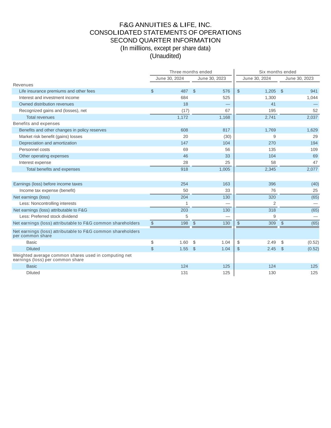 F&G ANNUITIES & LIFE, INC. CONSOLIDATED STATEMENTS OF OPERATIONS SECOND QUARTER INFORMATION (In millions, except per share data) (Unaudited) Three months ended Six months ended June 30, 2024 June 30, 2023 June 30, 2024 June 30, 2023 Revenues Life insurance premiums and other fees $ 487 $ 576 $ 1,205 $ 941 Interest and investment income 684 525 1,300 1,044 Owned distribution revenues 18 — 41 — Recognized gains and (losses), net (17) 67 195 52 Total revenues 1,172 1,168 2,741 2,037 Benefits and expenses Benefits and other changes in policy reserves 608 817 1,769 1,629 Market risk benefit (gains) losses 20 (30) 9 29 Depreciation and amortization 147 104 270 194 Personnel costs 69 56 135 109 Other operating expenses 46 33 104 69 Interest expense 28 25 58 47 Total benefits and expenses 918 1,005 2,345 2,077 Earnings (loss) before income taxes 254 163 396 (40) Income tax expense (benefit) 50 33 76 25 Net earnings (loss) 204 130 320 (65) Less: Noncontrolling interests 1 — 2 — Net earnings (loss) attributable to F&G 203 130 318 (65) Less: Preferred stock dividend 5 — 9 — Net earnings (loss) attributable to F&G common shareholders $ 198 $ 130 $ 309 $ (65) Net earnings (loss) attributable to F&G common shareholders per common share Basic $ 1.60 $ 1.04 $ 2.49 $ (0.52) Diluted $ 1.55 $ 1.04 $ 2.45 $ (0.52) Weighted average common shares used in computing net earnings (loss) per common share Basic 124 125 124 125 Diluted 131 125 130 125