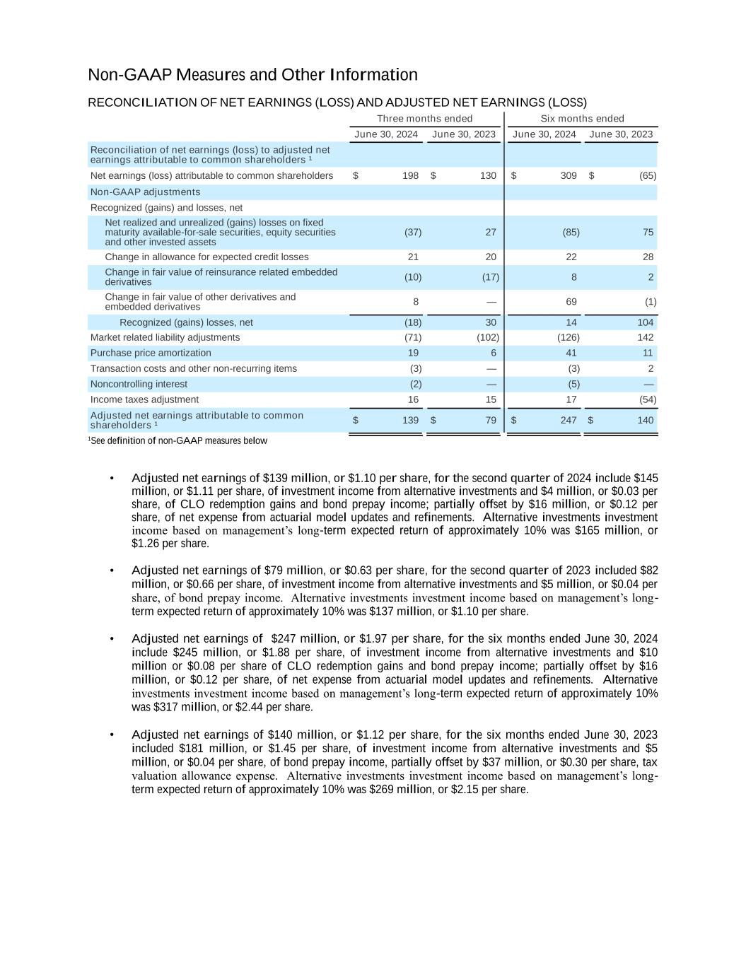 Non-GAAP Measures and Other Information RECONCILIATION OF NET EARNINGS (LOSS) AND ADJUSTED NET EARNINGS (LOSS) Three months ended Six months ended June 30, 2024 June 30, 2023 June 30, 2024 June 30, 2023 Reconciliation of net earnings (loss) to adjusted net earnings attributable to common shareholders ¹ Net earnings (loss) attributable to common shareholders $ 198 $ 130 $ 309 $ (65) Non-GAAP adjustments Recognized (gains) and losses, net Net realized and unrealized (gains) losses on fixed maturity available-for-sale securities, equity securities and other invested assets (37) 27 (85) 75 Change in allowance for expected credit losses 21 20 22 28 Change in fair value of reinsurance related embedded derivatives (10) (17) 8 2 Change in fair value of other derivatives and embedded derivatives 8 — 69 (1) Recognized (gains) losses, net (18) 30 14 104 Market related liability adjustments (71) (102) (126) 142 Purchase price amortization 19 6 41 11 Transaction costs and other non-recurring items (3) — (3) 2 Noncontrolling interest (2) — (5) — Income taxes adjustment 16 15 17 (54) Adjusted net earnings attributable to common shareholders ¹ $ 139 $ 79 $ 247 $ 140 1See definition of non-GAAP measures below • Adjusted net earnings of $139 million, or $1.10 per share, for the second quarter of 2024 include $145 million, or $1.11 per share, of investment income from alternative investments and $4 million, or $0.03 per share, of CLO redemption gains and bond prepay income; partially offset by $16 million, or $0.12 per share, of net expense from actuarial model updates and refinements. Alternative investments investment income based on management’s long-term expected return of approximately 10% was $165 million, or $1.26 per share. • Adjusted net earnings of $79 million, or $0.63 per share, for the second quarter of 2023 included $82 million, or $0.66 per share, of investment income from alternative investments and $5 million, or $0.04 per share, of bond prepay income. Alternative investments investment income based on management’s long- term expected return of approximately 10% was $137 million, or $1.10 per share. • Adjusted net earnings of $247 million, or $1.97 per share, for the six months ended June 30, 2024 include $245 million, or $1.88 per share, of investment income from alternative investments and $10 million or $0.08 per share of CLO redemption gains and bond prepay income; partially offset by $16 million, or $0.12 per share, of net expense from actuarial model updates and refinements. Alternative investments investment income based on management’s long-term expected return of approximately 10% was $317 million, or $2.44 per share. • Adjusted net earnings of $140 million, or $1.12 per share, for the six months ended June 30, 2023 included $181 million, or $1.45 per share, of investment income from alternative investments and $5 million, or $0.04 per share, of bond prepay income, partially offset by $37 million, or $0.30 per share, tax valuation allowance expense. Alternative investments investment income based on management’s long- term expected return of approximately 10% was $269 million, or $2.15 per share.