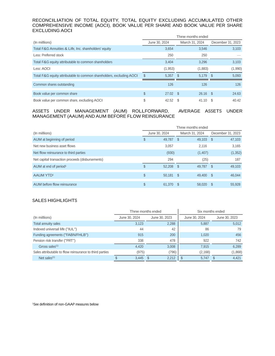 RECONCILIATION OF TOTAL EQUITY, TOTAL EQUITY EXCLUDING ACCUMULATED OTHER COMPREHENSIVE INCOME (AOCI), BOOK VALUE PER SHARE AND BOOK VALUE PER SHARE EXCLUDING AOCI Three months ended (In millions) June 30, 2024 March 31, 2024 December 31, 2023 Total F&G Annuities & Life, Inc. shareholders' equity 3,654 3,546 3,103 Less: Preferred stock 250 250 — Total F&G equity attributable to common shareholders 3,404 3,296 3,103 Less: AOCI (1,953) (1,883) (1,990) Total F&G equity attributable to common shareholders, excluding AOCI $ 5,357 $ 5,179 $ 5,093 Common shares outstanding 126 126 126 Book value per common share $ 27.02 $ 26.16 $ 24.63 Book value per common share, excluding AOCI $ 42.52 $ 41.10 $ 40.42 ASSETS UNDER MANAGEMENT (AUM) ROLLFORWARD, AVERAGE ASSETS UNDER MANAGEMENT (AAUM) AND AUM BEFORE FLOW REINSURANCE Three months ended (In millions) June 30, 2024 March 31, 2024 December 31, 2023 AUM at beginning of period $ 49,787 $ 49,103 $ 47,103 Net new business asset flows 3,057 2,116 3,165 Net flow reinsurance to third parties (930) (1,407) (1,352) Net capital transaction proceeds (disbursements) 294 (25) 187 AUM at end of period¹ $ 52,208 $ 49,787 $ 49,103 AAUM YTD¹ $ 50,181 $ 49,400 $ 46,044 AUM before flow reinsurance $ 61,370 $ 58,020 $ 55,928 SALES HIGHLIGHTS Three months ended Six months ended (In millions) June 30, 2024 June 30, 2023 June 30, 2024 June 30, 2023 Total annuity sales 3,123 2,288 5,887 5,012 Indexed universal life ("IUL") 44 42 86 79 Funding agreements ("FABN/FHLB") 915 200 1,020 456 Pension risk transfer ("PRT") 338 478 922 742 Gross sales(1) 4,420 3,008 7,915 6,289 Sales attributable to flow reinsurance to third parties (975) (796) (2,168) (1,868) Net sales(1) $ 3,445 $ 2,212 $ 5,747 $ 4,421 1See definition of non-GAAP measures below
