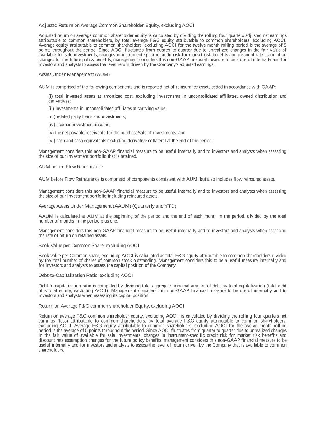 Adjusted Return on Average Common Shareholder Equity, excluding AOCI Adjusted return on average common shareholder equity is calculated by dividing the rolling four quarters adjusted net earnings attributable to common shareholders, by total average F&G equity attributable to common shareholders, excluding AOCI. Average equity attributable to common shareholders, excluding AOCI for the twelve month rolling period is the average of 5 points throughout the period. Since AOCI fluctuates from quarter to quarter due to unrealized changes in the fair value of available for sale investments, changes in instrument-specific credit risk for market risk benefits and discount rate assumption changes for the future policy benefits, management considers this non-GAAP financial measure to be a useful internally and for investors and analysts to assess the level return driven by the Company's adjusted earnings. Assets Under Management (AUM) AUM is comprised of the following components and is reported net of reinsurance assets ceded in accordance with GAAP: (i) total invested assets at amortized cost, excluding investments in unconsolidated affiliates, owned distribution and derivatives; (ii) investments in unconsolidated affiliates at carrying value; (iii) related party loans and investments; (iv) accrued investment income; (v) the net payable/receivable for the purchase/sale of investments; and (vi) cash and cash equivalents excluding derivative collateral at the end of the period. Management considers this non-GAAP financial measure to be useful internally and to investors and analysts when assessing the size of our investment portfolio that is retained. AUM before Flow Reinsurance AUM before Flow Reinsurance is comprised of components consistent with AUM, but also includes flow reinsured assets. Management considers this non-GAAP financial measure to be useful internally and to investors and analysts when assessing the size of our investment portfolio including reinsured assets. Average Assets Under Management (AAUM) (Quarterly and YTD) AAUM is calculated as AUM at the beginning of the period and the end of each month in the period, divided by the total number of months in the period plus one. Management considers this non-GAAP financial measure to be useful internally and to investors and analysts when assessing the rate of return on retained assets. Book Value per Common Share, excluding AOCI Book value per Common share, excluding AOCI is calculated as total F&G equity attributable to common shareholders divided by the total number of shares of common stock outstanding. Management considers this to be a useful measure internally and for investors and analysts to assess the capital position of the Company. Debt-to-Capitalization Ratio, excluding AOCI Debt-to-capitalization ratio is computed by dividing total aggregate principal amount of debt by total capitalization (total debt plus total equity, excluding AOCI). Management considers this non-GAAP financial measure to be useful internally and to investors and analysts when assessing its capital position. Return on Average F&G common shareholder Equity, excluding AOCI Return on average F&G common shareholder equity, excluding AOCI is calculated by dividing the rolling four quarters net earnings (loss) attributable to common shareholders, by total average F&G equity attributable to common shareholders, excluding AOCI. Average F&G equity attributable to common shareholders, excluding AOCI for the twelve month rolling period is the average of 5 points throughout the period. Since AOCI fluctuates from quarter to quarter due to unrealized changes in the fair value of available for sale investments, changes in instrument-specific credit risk for market risk benefits and discount rate assumption changes for the future policy benefits, management considers this non-GAAP financial measure to be useful internally and for investors and analysts to assess the level of return driven by the Company that is available to common shareholders.
