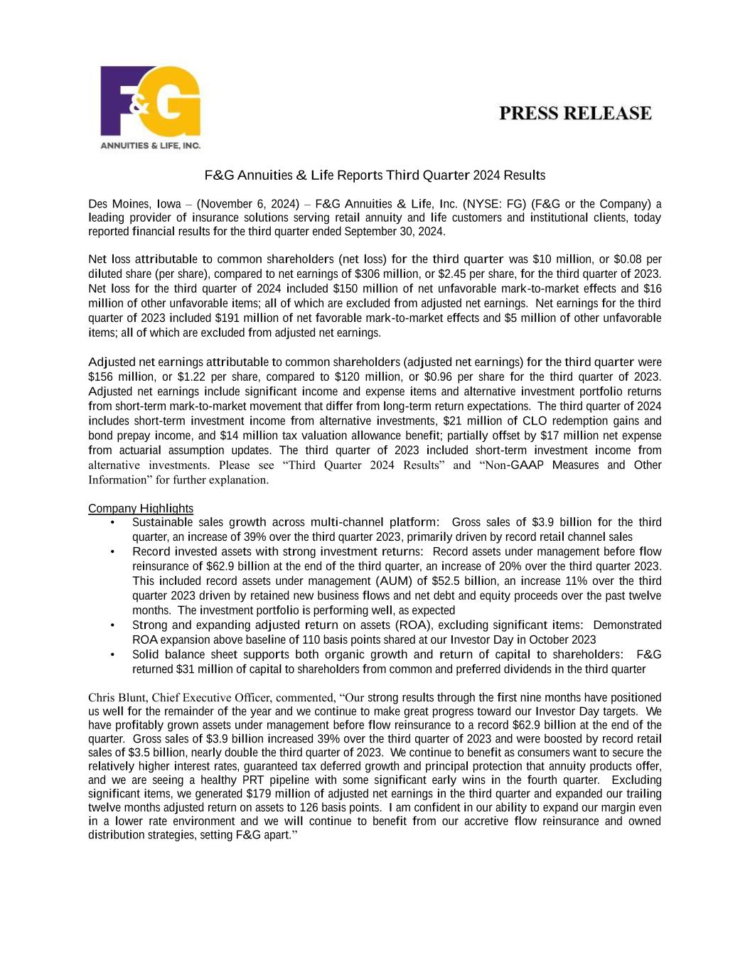 F&G Annuities & Life Reports Third Quarter 2024 Results Des Moines, Iowa – (November 6, 2024) – F&G Annuities & Life, Inc. (NYSE: FG) (F&G or the Company) a leading provider of insurance solutions serving retail annuity and life customers and institutional clients, today reported financial results for the third quarter ended September 30, 2024. Net loss attributable to common shareholders (net loss) for the third quarter was $10 million, or $0.08 per diluted share (per share), compared to net earnings of $306 million, or $2.45 per share, for the third quarter of 2023. Net loss for the third quarter of 2024 included $150 million of net unfavorable mark-to-market effects and $16 million of other unfavorable items; all of which are excluded from adjusted net earnings. Net earnings for the third quarter of 2023 included $191 million of net favorable mark-to-market effects and $5 million of other unfavorable items; all of which are excluded from adjusted net earnings. Adjusted net earnings attributable to common shareholders (adjusted net earnings) for the third quarter were $156 million, or $1.22 per share, compared to $120 million, or $0.96 per share for the third quarter of 2023. Adjusted net earnings include significant income and expense items and alternative investment portfolio returns from short-term mark-to-market movement that differ from long-term return expectations. The third quarter of 2024 includes short-term investment income from alternative investments, $21 million of CLO redemption gains and bond prepay income, and $14 million tax valuation allowance benefit; partially offset by $17 million net expense from actuarial assumption updates. The third quarter of 2023 included short-term investment income from alternative investments. Please see “Third Quarter 2024 Results” and “Non-GAAP Measures and Other Information” for further explanation. Company Highlights • Sustainable sales growth across multi-channel platform: Gross sales of $3.9 billion for the third quarter, an increase of 39% over the third quarter 2023, primarily driven by record retail channel sales • Record invested assets with strong investment returns: Record assets under management before flow reinsurance of $62.9 billion at the end of the third quarter, an increase of 20% over the third quarter 2023. This included record assets under management (AUM) of $52.5 billion, an increase 11% over the third quarter 2023 driven by retained new business flows and net debt and equity proceeds over the past twelve months. The investment portfolio is performing well, as expected • Strong and expanding adjusted return on assets (ROA), excluding significant items: Demonstrated ROA expansion above baseline of 110 basis points shared at our Investor Day in October 2023 • Solid balance sheet supports both organic growth and return of capital to shareholders: F&G returned $31 million of capital to shareholders from common and preferred dividends in the third quarter Chris Blunt, Chief Executive Officer, commented, “Our strong results through the first nine months have positioned us well for the remainder of the year and we continue to make great progress toward our Investor Day targets. We have profitably grown assets under management before flow reinsurance to a record $62.9 billion at the end of the quarter. Gross sales of $3.9 billion increased 39% over the third quarter of 2023 and were boosted by record retail sales of $3.5 billion, nearly double the third quarter of 2023. We continue to benefit as consumers want to secure the relatively higher interest rates, guaranteed tax deferred growth and principal protection that annuity products offer, and we are seeing a healthy PRT pipeline with some significant early wins in the fourth quarter. Excluding significant items, we generated $179 million of adjusted net earnings in the third quarter and expanded our trailing twelve months adjusted return on assets to 126 basis points. I am confident in our ability to expand our margin even in a lower rate environment and we will continue to benefit from our accretive flow reinsurance and owned distribution strategies, setting F&G apart.”