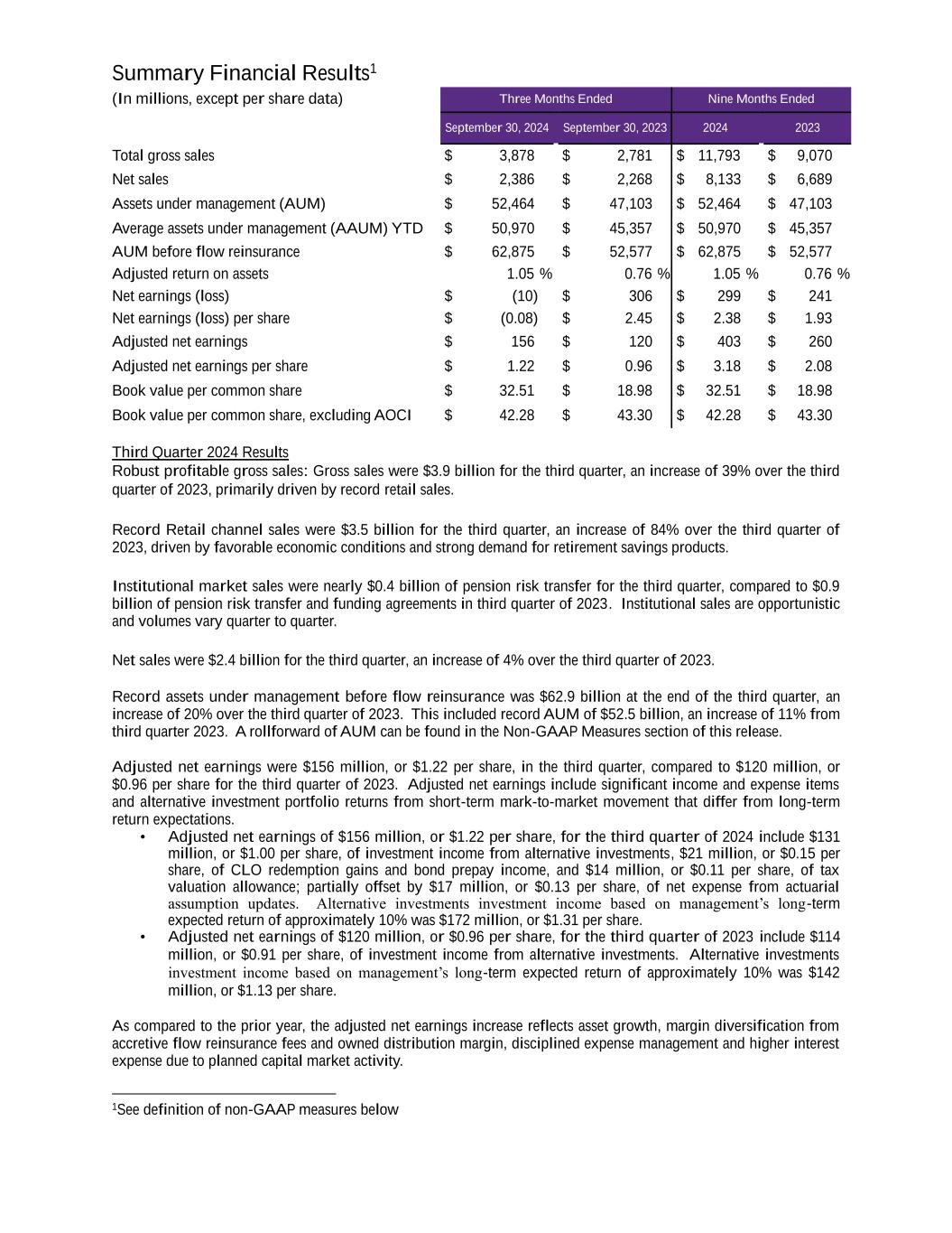 Summary Financial Results1 (In millions, except per share data) Three Months Ended Nine Months Ended September 30, 2024 September 30, 2023 2024 2023 Total gross sales $ 3,878 $ 2,781 $ 11,793 $ 9,070 Net sales $ 2,386 $ 2,268 $ 8,133 $ 6,689 Assets under management (AUM) $ 52,464 $ 47,103 $ 52,464 $ 47,103 Average assets under management (AAUM) YTD $ 50,970 $ 45,357 $ 50,970 $ 45,357 AUM before flow reinsurance $ 62,875 $ 52,577 $ 62,875 $ 52,577 Adjusted return on assets 1.05 % 0.76 % 1.05 % 0.76 % Net earnings (loss) $ (10) $ 306 $ 299 $ 241 Net earnings (loss) per share $ (0.08) $ 2.45 $ 2.38 $ 1.93 Adjusted net earnings $ 156 $ 120 $ 403 $ 260 Adjusted net earnings per share $ 1.22 $ 0.96 $ 3.18 $ 2.08 Book value per common share $ 32.51 $ 18.98 $ 32.51 $ 18.98 Book value per common share, excluding AOCI $ 42.28 $ 43.30 $ 42.28 $ 43.30 Third Quarter 2024 Results Robust profitable gross sales: Gross sales were $3.9 billion for the third quarter, an increase of 39% over the third quarter of 2023, primarily driven by record retail sales. Record Retail channel sales were $3.5 billion for the third quarter, an increase of 84% over the third quarter of 2023, driven by favorable economic conditions and strong demand for retirement savings products. Institutional market sales were nearly $0.4 billion of pension risk transfer for the third quarter, compared to $0.9 billion of pension risk transfer and funding agreements in third quarter of 2023. Institutional sales are opportunistic and volumes vary quarter to quarter. Net sales were $2.4 billion for the third quarter, an increase of 4% over the third quarter of 2023. Record assets under management before flow reinsurance was $62.9 billion at the end of the third quarter, an increase of 20% over the third quarter of 2023. This included record AUM of $52.5 billion, an increase of 11% from third quarter 2023. A rollforward of AUM can be found in the Non-GAAP Measures section of this release. Adjusted net earnings were $156 million, or $1.22 per share, in the third quarter, compared to $120 million, or $0.96 per share for the third quarter of 2023. Adjusted net earnings include significant income and expense items and alternative investment portfolio returns from short-term mark-to-market movement that differ from long-term return expectations. • Adjusted net earnings of $156 million, or $1.22 per share, for the third quarter of 2024 include $131 million, or $1.00 per share, of investment income from alternative investments, $21 million, or $0.15 per share, of CLO redemption gains and bond prepay income, and $14 million, or $0.11 per share, of tax valuation allowance; partially offset by $17 million, or $0.13 per share, of net expense from actuarial assumption updates. Alternative investments investment income based on management’s long-term expected return of approximately 10% was $172 million, or $1.31 per share. • Adjusted net earnings of $120 million, or $0.96 per share, for the third quarter of 2023 include $114 million, or $0.91 per share, of investment income from alternative investments. Alternative investments investment income based on management’s long-term expected return of approximately 10% was $142 million, or $1.13 per share. As compared to the prior year, the adjusted net earnings increase reflects asset growth, margin diversification from accretive flow reinsurance fees and owned distribution margin, disciplined expense management and higher interest expense due to planned capital market activity. 1See definition of non-GAAP measures below